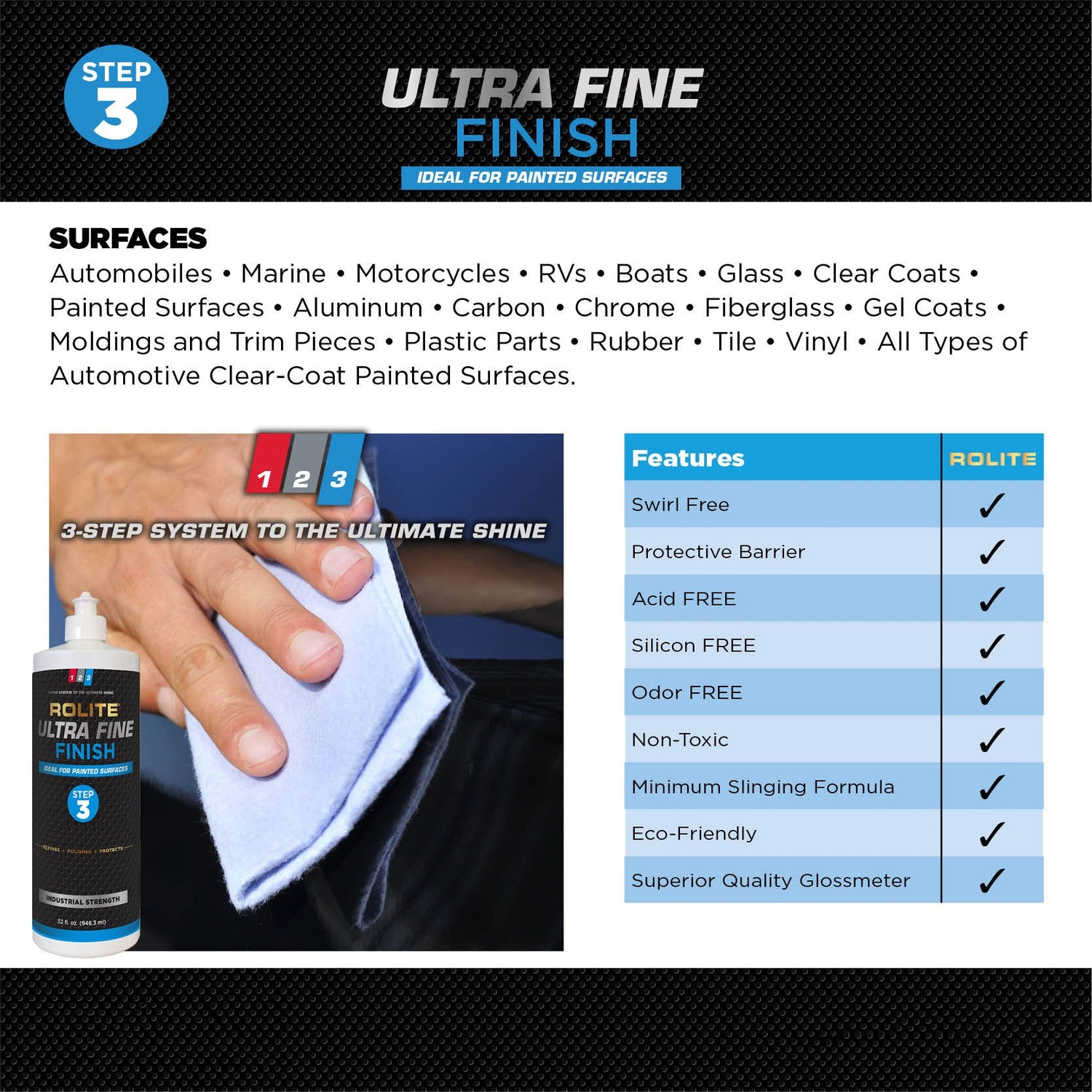 - Rolite's Ultra Fine Finish refines, polishes and protects - innovative ultra fine finish is specifically formulated to remove micro-finishing scratch & swirl marks and provide a superior finish