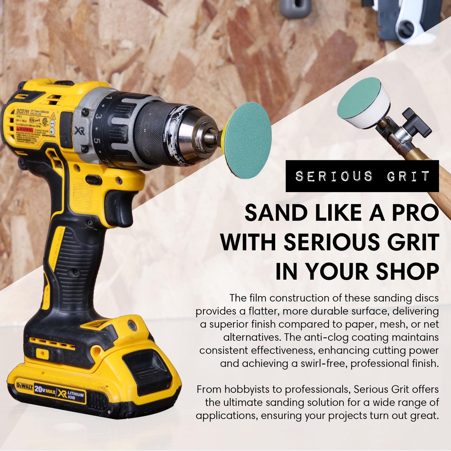 Serious Grit - 3-Inch 400 Grit Sanding Discs - Heavy-Duty Hook & Loop Film Discs - Sandpaper for Woodturning, Bowl Sanding & Power Tool Drill Attachment Sanding Pads - Pack of 50
