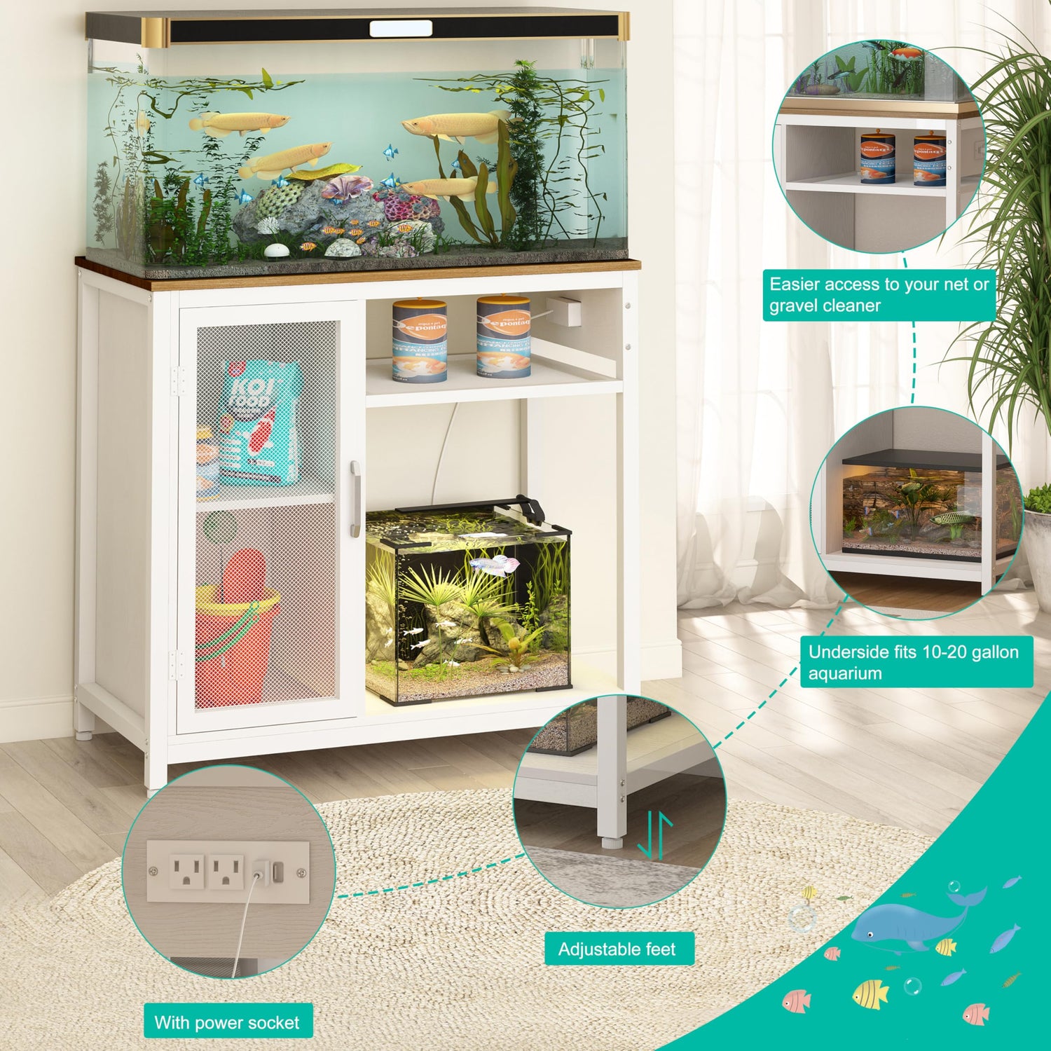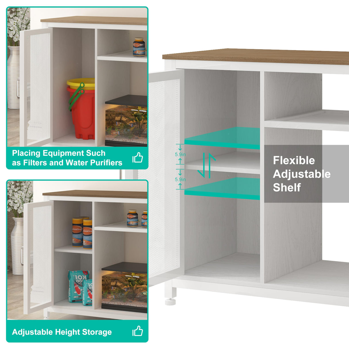 - Storage cabinet : This fish tank with stand easily keeps everything organized. The built-in cabinet stores fish food, cleaning tools, and other accessories while the adjustable shelves help accommodate items of various sizes