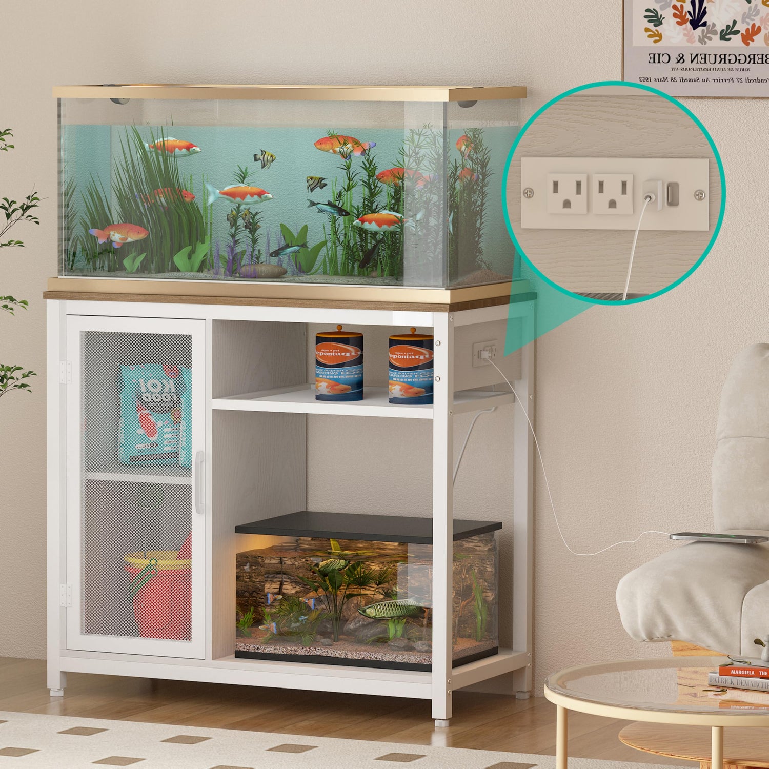 Details: 40-50 Gallon Aquarium Stand,Fish Tank Stand with Power Outlets, Aquarium Cabinet for Fish Tank,Metal Fish Tank Stand with Storage Suitable for Turtle Tank, Reptile Terrarium, 660LBS Capacity, White