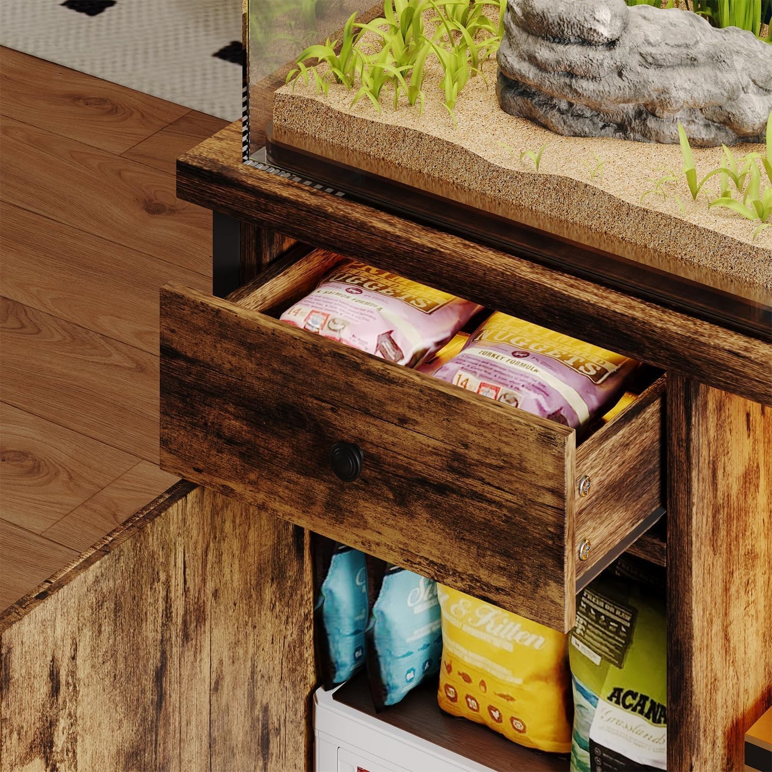 • Large Storage Space: The reptile terrariums stand offers a spacious cabinet and 1 drawer for storing fish food, cleaning tools, and accessories, keeping your area tidy. An additional metal rack is included for easy access to nets or gravel cleaners