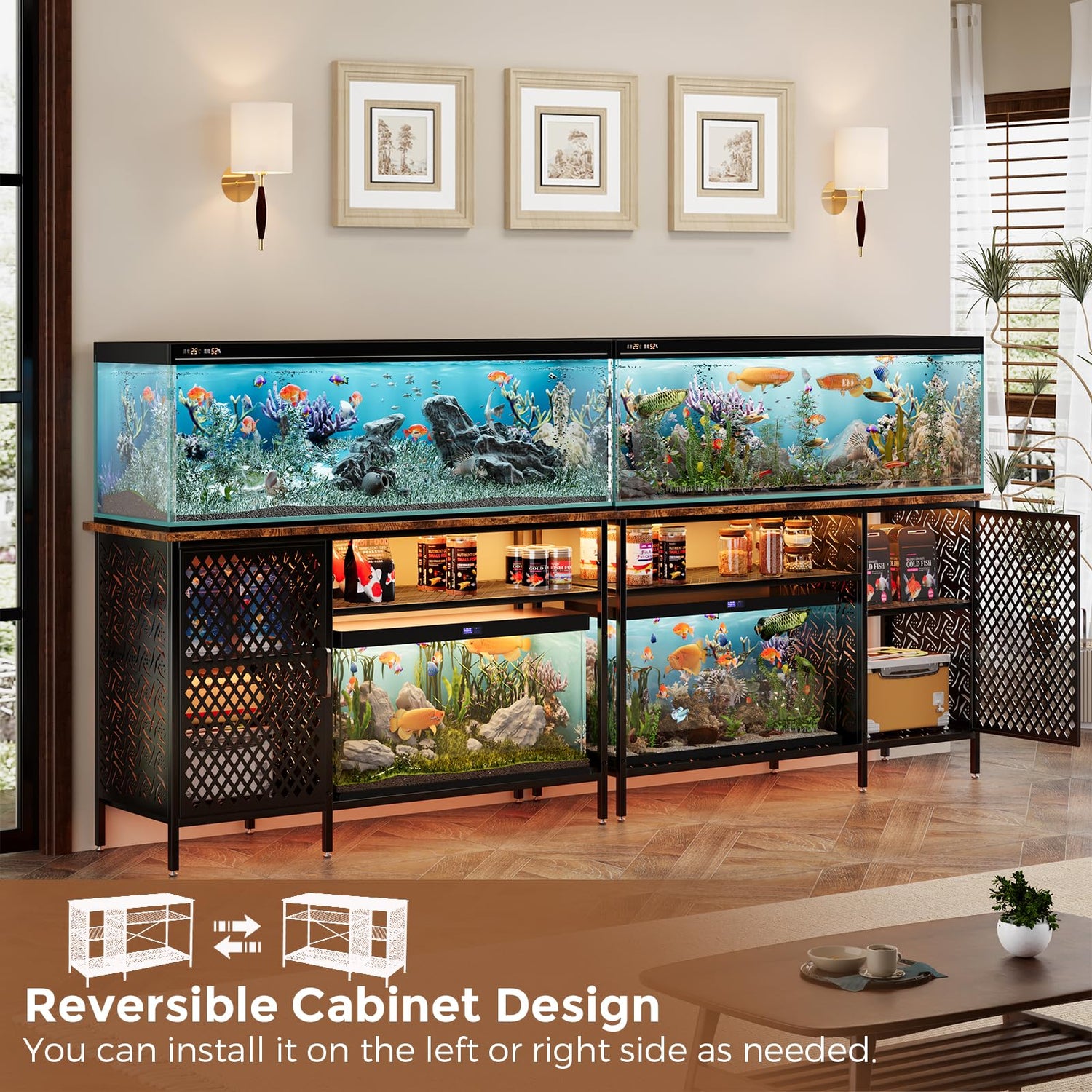 - [Space-saving 2-in-1 Design]Fish tank stand is designed with two levels for fish tank placement, the desktop can accommodate differently shaped 55-75 gallon fish tanks, and the bottom can also hold small 40-50 gallon fish tanks. This structure raises the height of the fish tank to a more comfortable viewing height while making the most of limited space.You can install the door on the left or right side as required