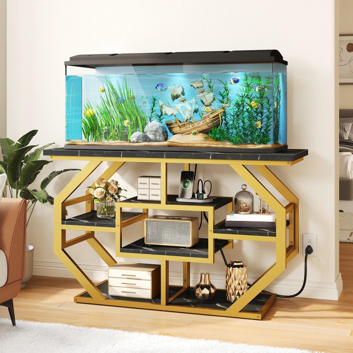 - Outstanding design: Offer gorgeous style and storage all wrapped up in one with our aquarium stand. Defined by a faux marble veneer top with realistic-textured while sitting on an openwork frame base, this modern fish tank stand will set the tone in your home