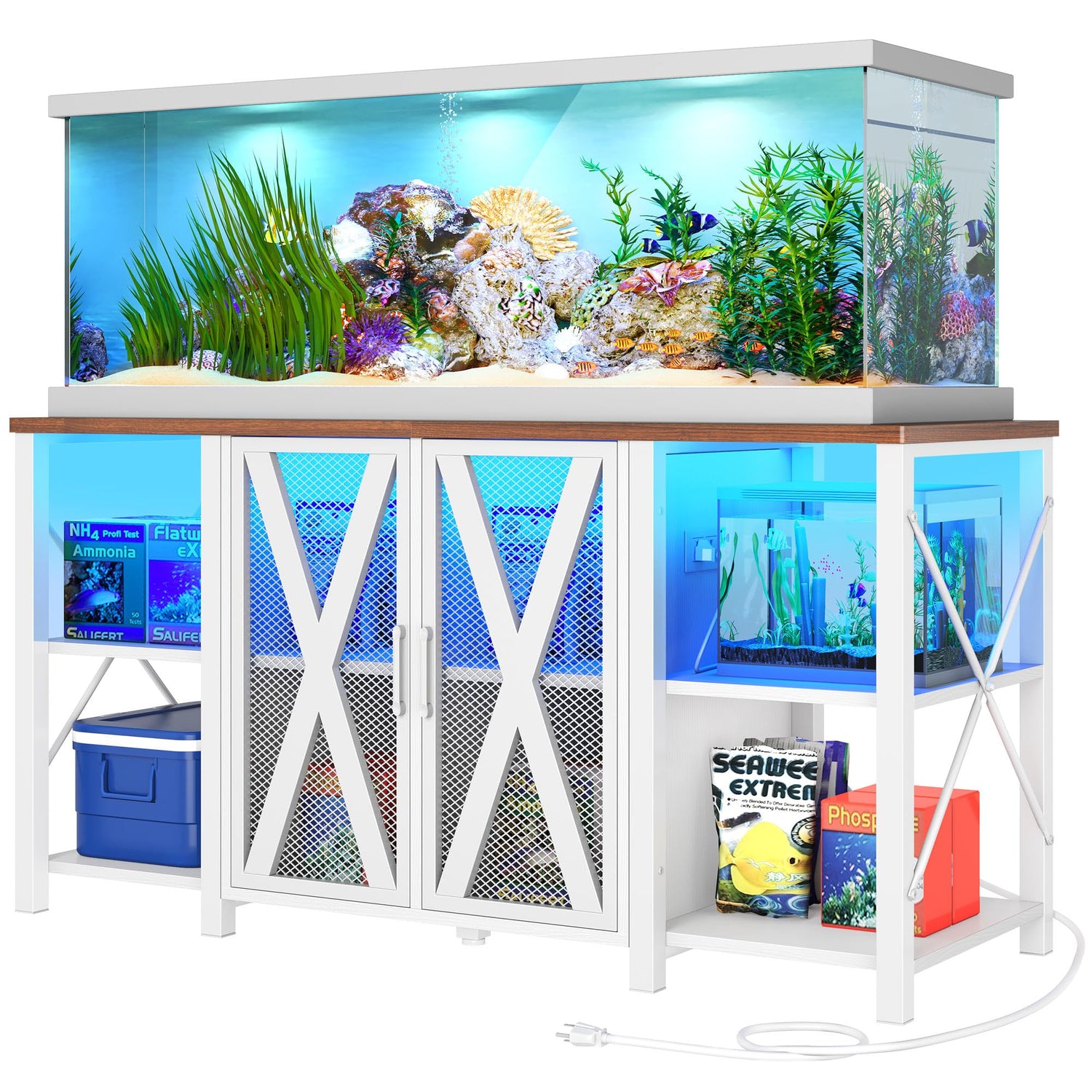 DWVO 75-120 Gallon Aquarium Stand with Power Outlet & LED Light, Cabinet for Accessories Storage - Heavy Duty Metal Fish Tank Stand Suitable for Turtle Tank, Reptile Terrarium, 2000LBS Capacity, White
