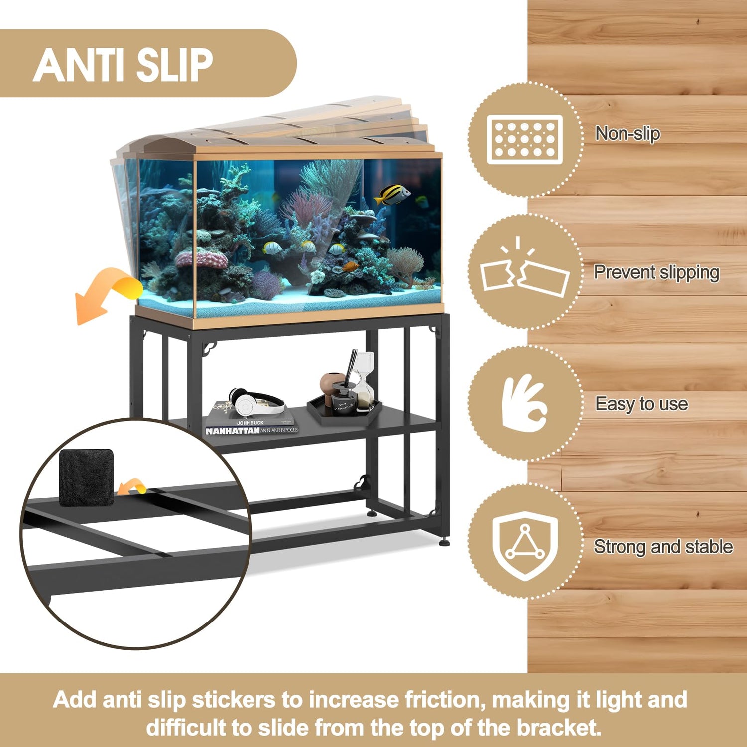- Keep Level: This aquarium stand features adjustable leveling feet to ensure stability and prevent rocking or wobbling. We added a non-slip sticker to increase friction, making it heavy and difficult to slide off the top of the stand. This is the perfect way to protect your aquarium and keep your fish safe and happy.