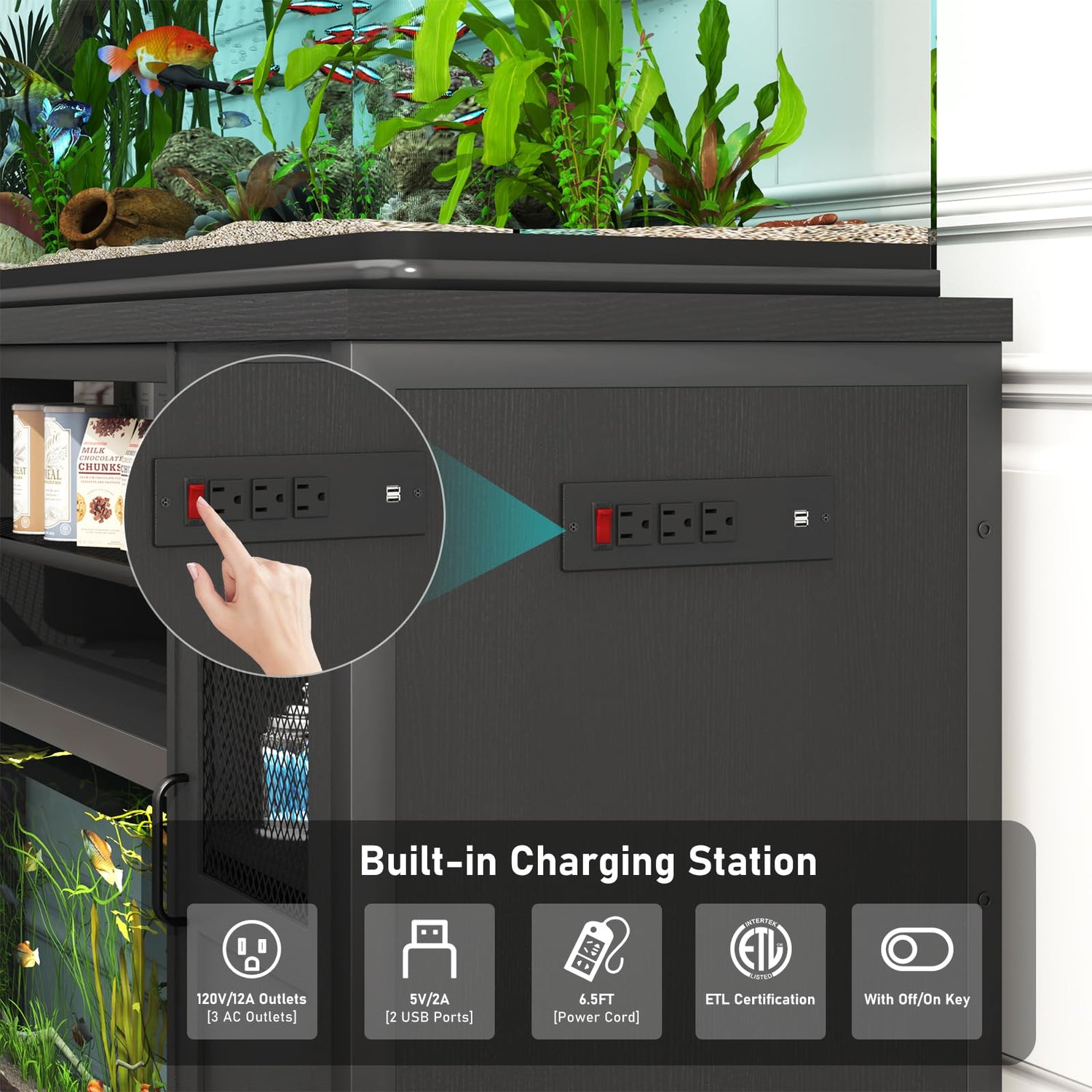 - With Power Outlets with Switches: Our fish tank cabinets side are designed with power outlets with switches, making it easier for you to provide power to filters, aeration pumps, heater rods and other devices as you wish. The design of the charge station with a switch can better protect the electrical appliances and also save more energy. There is also an opening at the back of the stand and convenient cord management.