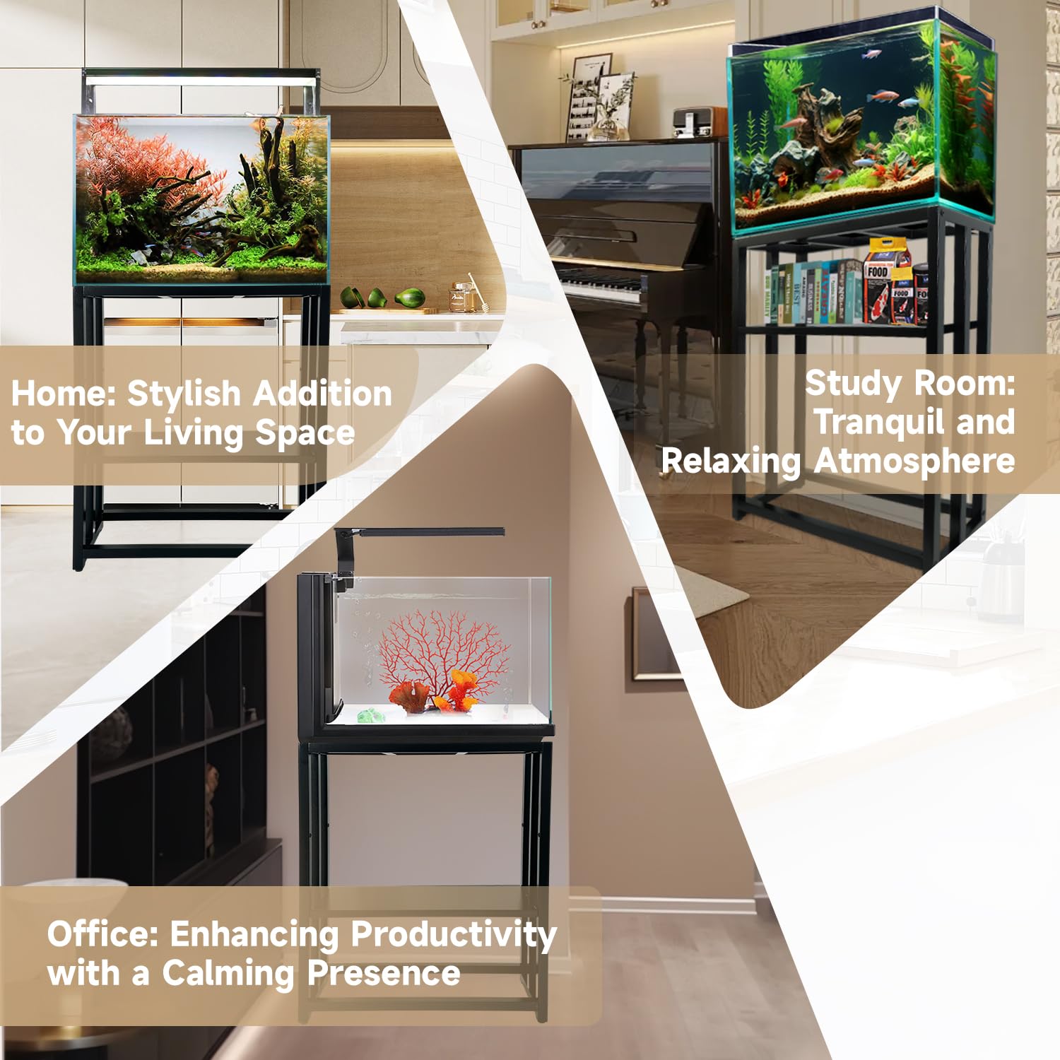 - Space-Saving Aquarium Stand: The aquarium stand features a two-in-one space design, serving as both a display for your aquarium and a space-saving solution. With sleek black steel legs and a powder-coated finish, it adds a touch of modern elegance to your decor, effortlessly complementing your existing furniture.