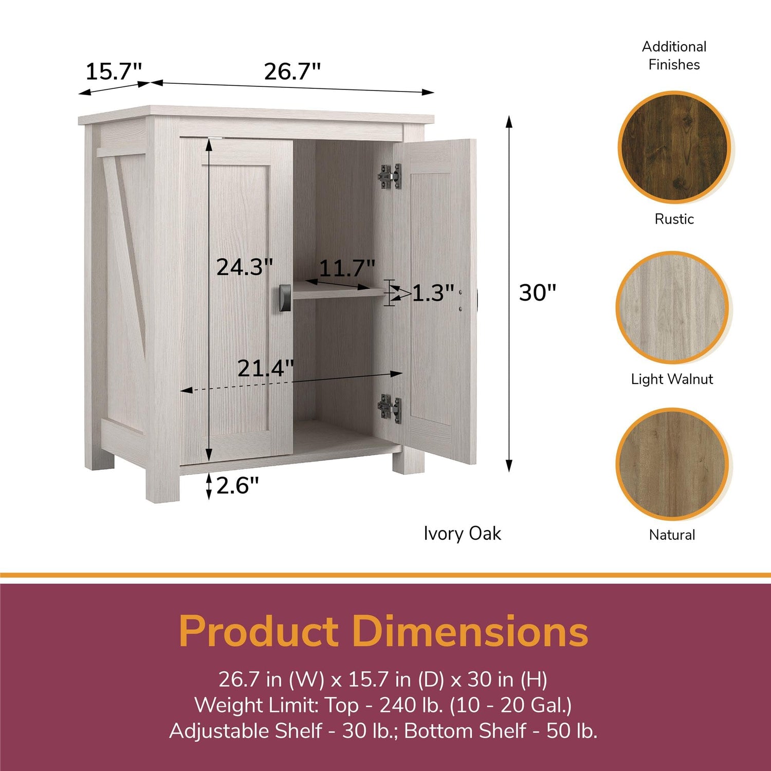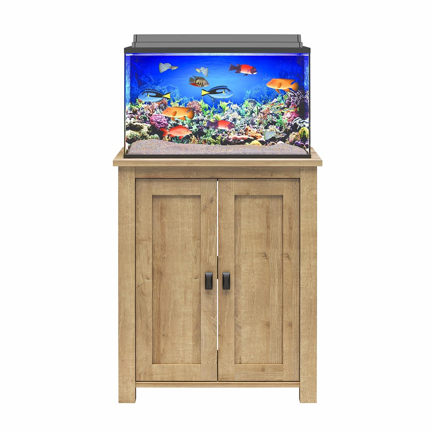 Details: Make your room come alive with the Flipper by Ollie & Hutch Farmington 10-20 Gallon Aquarium or Terrarium Stand. This stand can hold tanks between 10 gallons and 20 gallons depending on your tank size. Aquarium tank is not included. The 2 doors conceal all the storage you need to store away food, nets, and cleaning supplies on the 2 shelves. The back panel features an open concept to make attaching accessories to the tank easy. Made of laminated MDF and particleboard, the Stand features a weathered woodgrain finish that can be paired with any style and décor. The Stand ships flat to your door and requires assembly upon opening. Two adults are recommended to assemble. Once assembled, the Aquarium Stand measures to be 30"H x 26.7"W x 15.67"D.