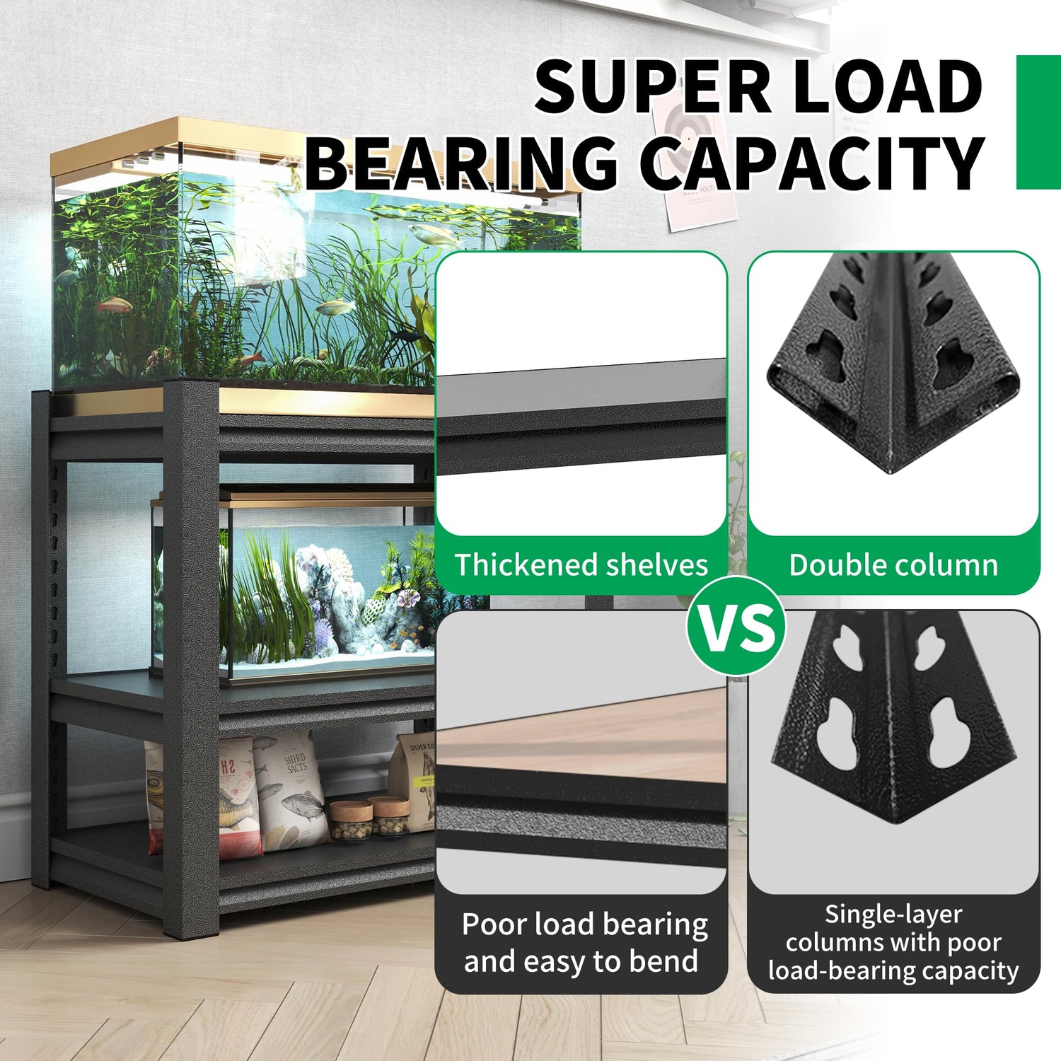 - 【HEAVY DUTY FISH TANK STAND】This fish tank stand is made of heavy-duty steel, the shelves and columns are made of double-layered metal, there is 1 support beams underneath each sturdy thickened metal heavy-duty shelf, suitable for most 20-30 gallon terrarium stand, so it's more stable and more durable than ordinary plastic or flimsy fish tank stands, and it won't bend due to the placement of the fish tanks.