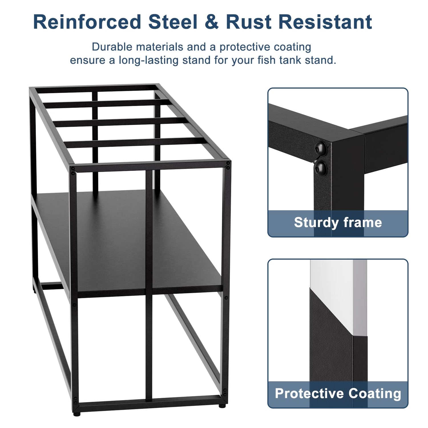 - DURABLE AND LONG-LASTING: Constructed with reinforced steel and a protective powder coating, this stand is built to last. It resists rust and wear, ensuring your aquarium setup remains safe and secure over time.