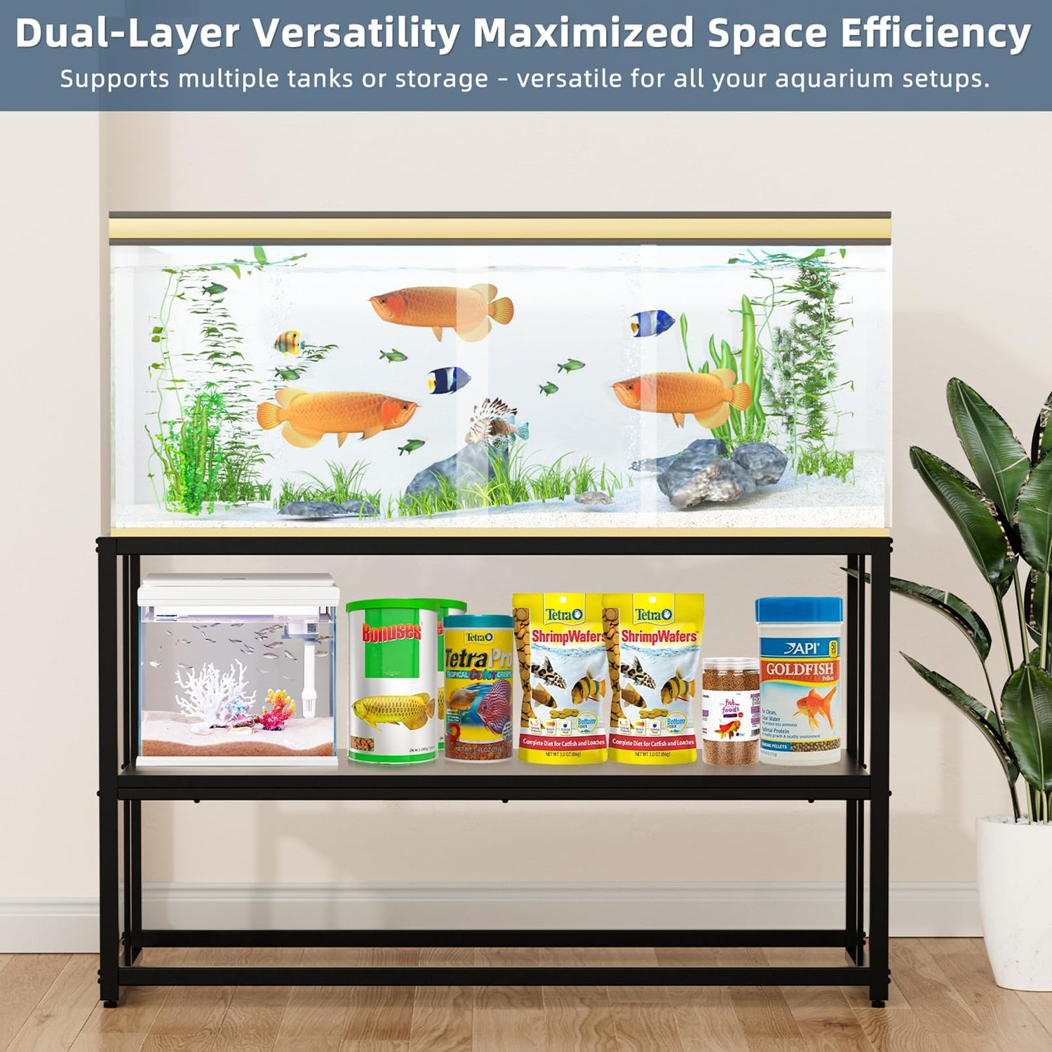 - DUAL-LAYER FUNCTIONALITY: The stand's two-layer design maximizes space efficiency. The upper layer is ideal for your primary aquarium, while the lower shelf can accommodate additional tanks or storage, making it versatile for various aquarium needs.