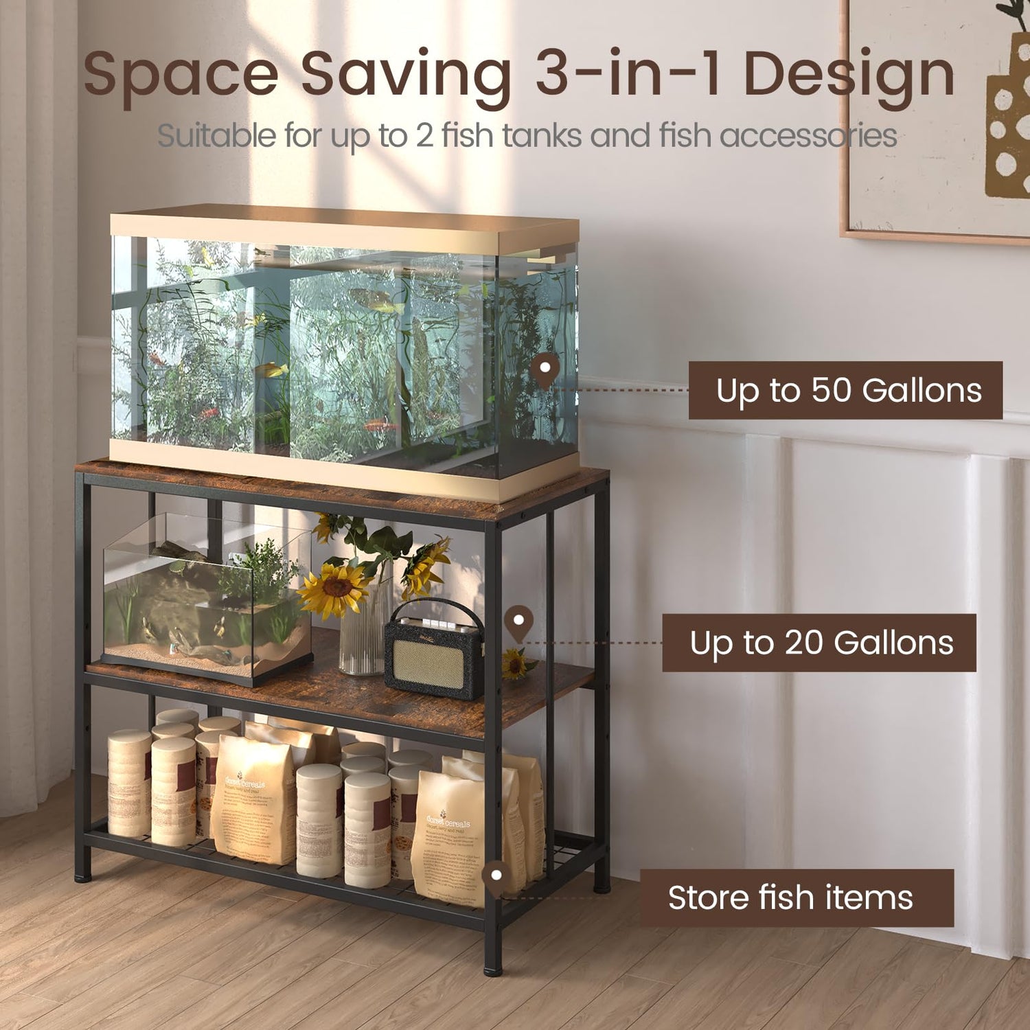 - Space Saving 3-In-1 Design: Our 40 gallon fish tank table stand features a 3-tier design. The top tier accommodates 40-50 gallon aquariums. The middle tier can be used for additional aquariums or other supplies, supporting tanks from 5 to 25 gallons. The bottom tier is ideal for storing fish food, cleaning tools, plants, books, and more. This vertical arrangement maximizes space efficiency and moisture resistance, allowing convenient access to your essentials at the same time.