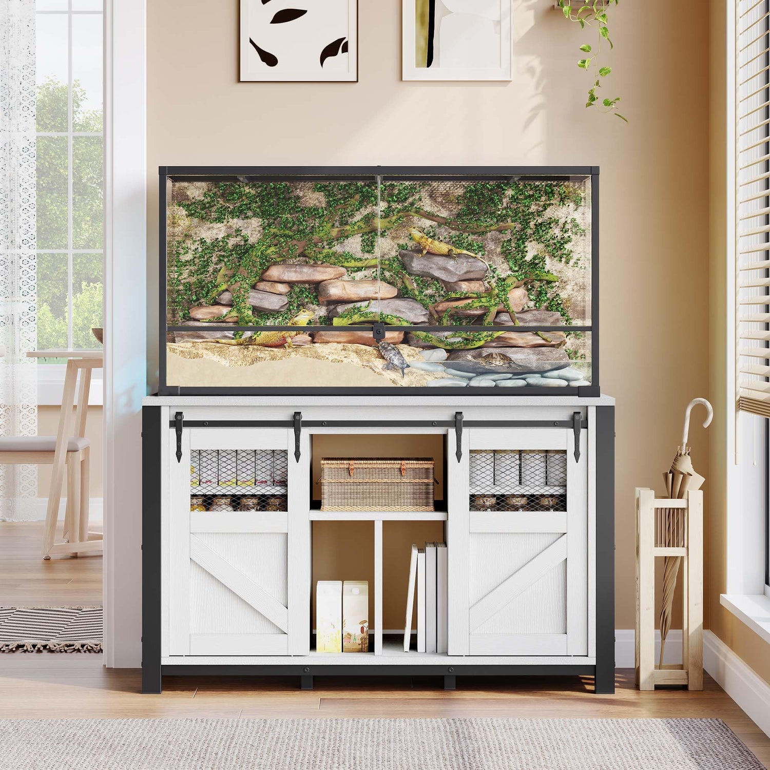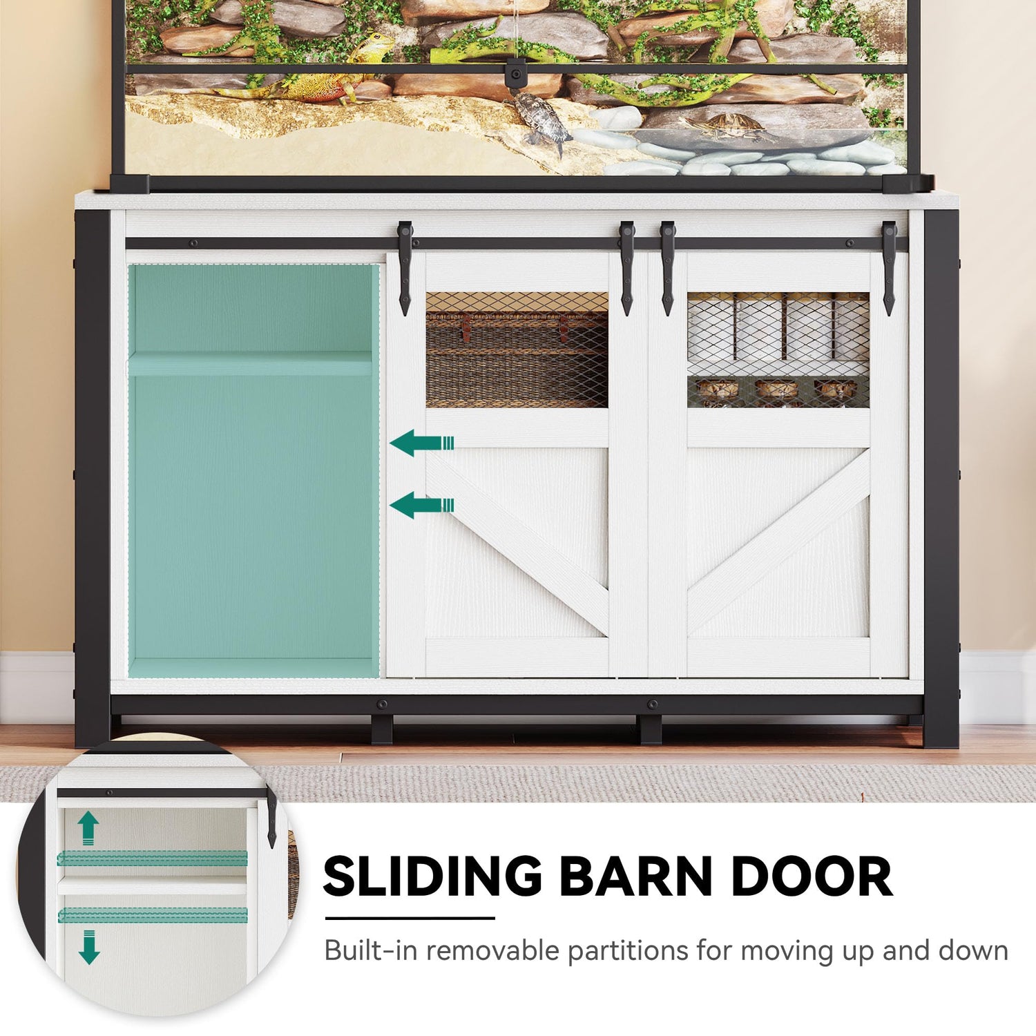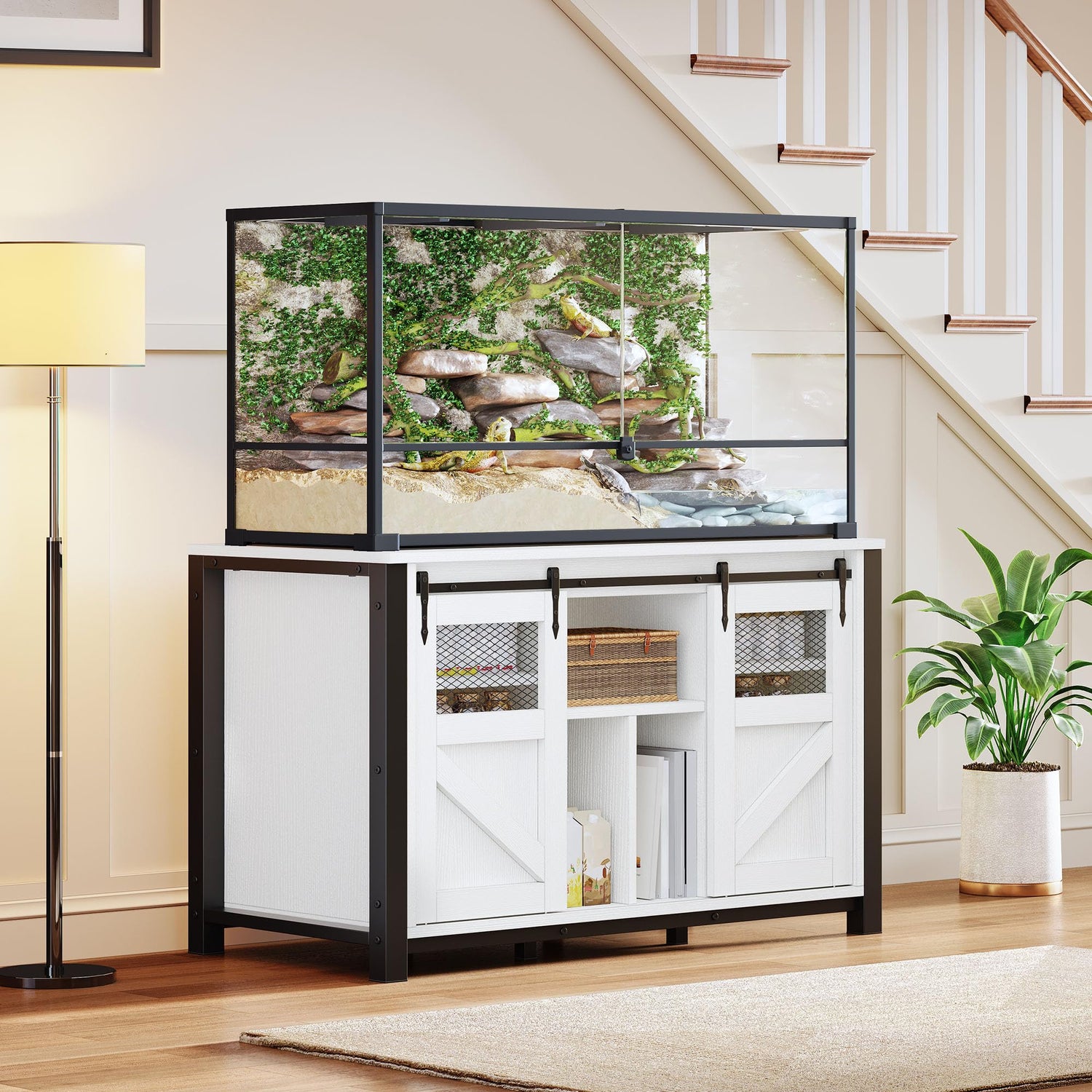 - 【SPACE-SAVING AND FUNCTIONAL DESIGN】YITAHOME reptile tank stand has an extra shelf on the top to place plants, photo frames and other decorations, designed with 6 compartments for storage, featuring 2 open storage spaces and 4 hidden storage spaces with adjustable or removable dividers on the left and right sides.You can move the barn door position as needed and switch freely between open and hidden storage space.The built-in cabinet stores fish food, cleaning tools, and other accessories