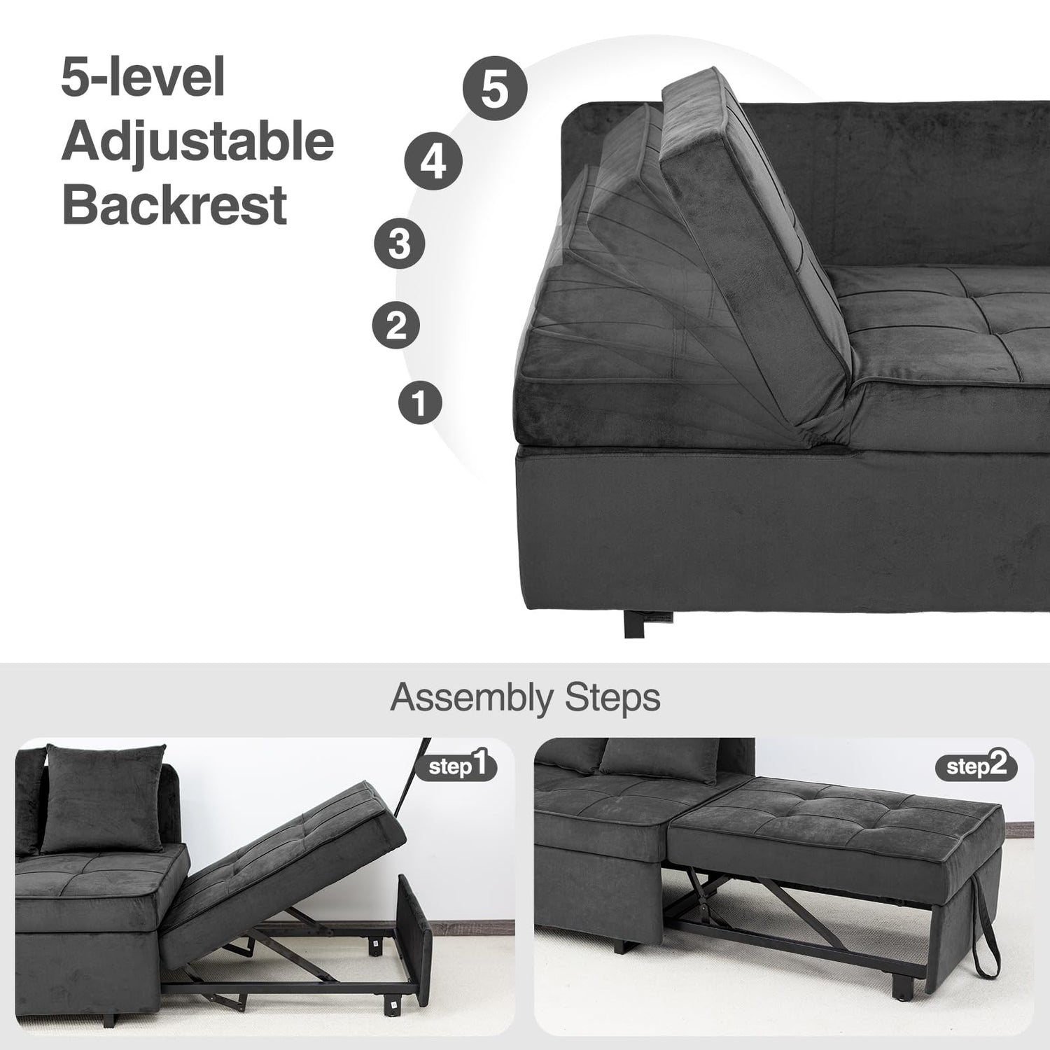 Convertible Sofa Bed 4-in-1 Velvet Sleeper Sofa Chair Bed Pull Out Futon Couch Bed with USB Ports 5 Adjustable Backrest and Pillow Fold Out Ottoman Bed for Adults Small Spaces Living Room, Dark Grey