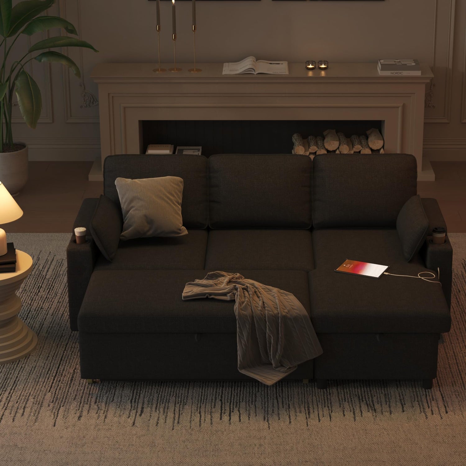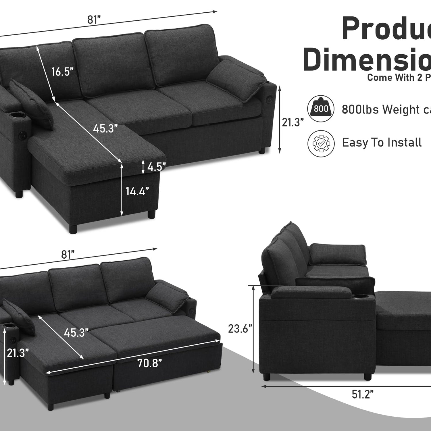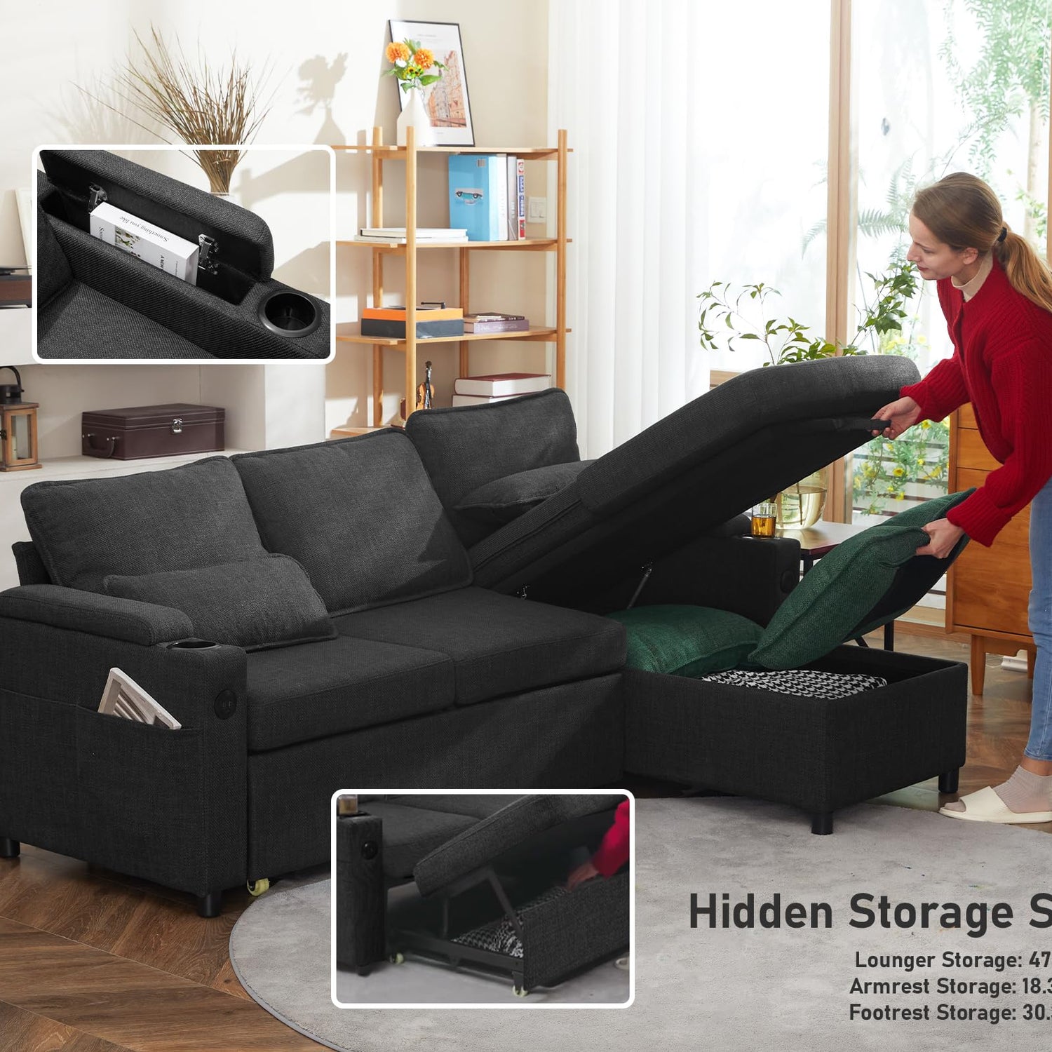 DURASPACE Sofa Bed Sleeper Pull Out 2 in 1 Sectional Sleeper Sofa Couches with Storage,USB, Cup Holder,Pullout Sectional Couches for Apartment Living Room (Dark Gray)