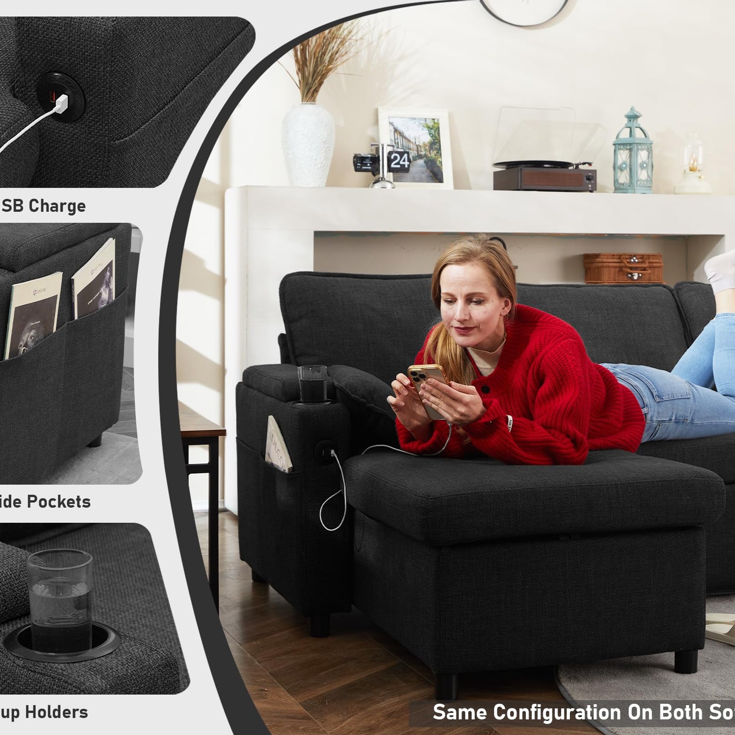 - 【Charging and Cup Holders】There are 2 USB charging ports on the both armrest of the sofa for providing continuous power supply for your phone. And 2 cup holders design to place drinks and cups. 2 side pockets offer even more storage options.