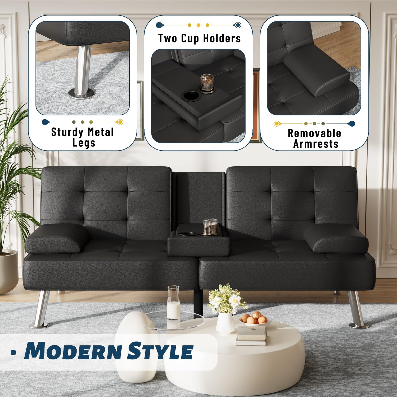 Furmax Futon Sofa Bed Adjustable Futon Couch Modern Sleeper Sofa Bed for Living Room, Business Office, Recliner Sofa with Cup Holders (PU Leather, Black)