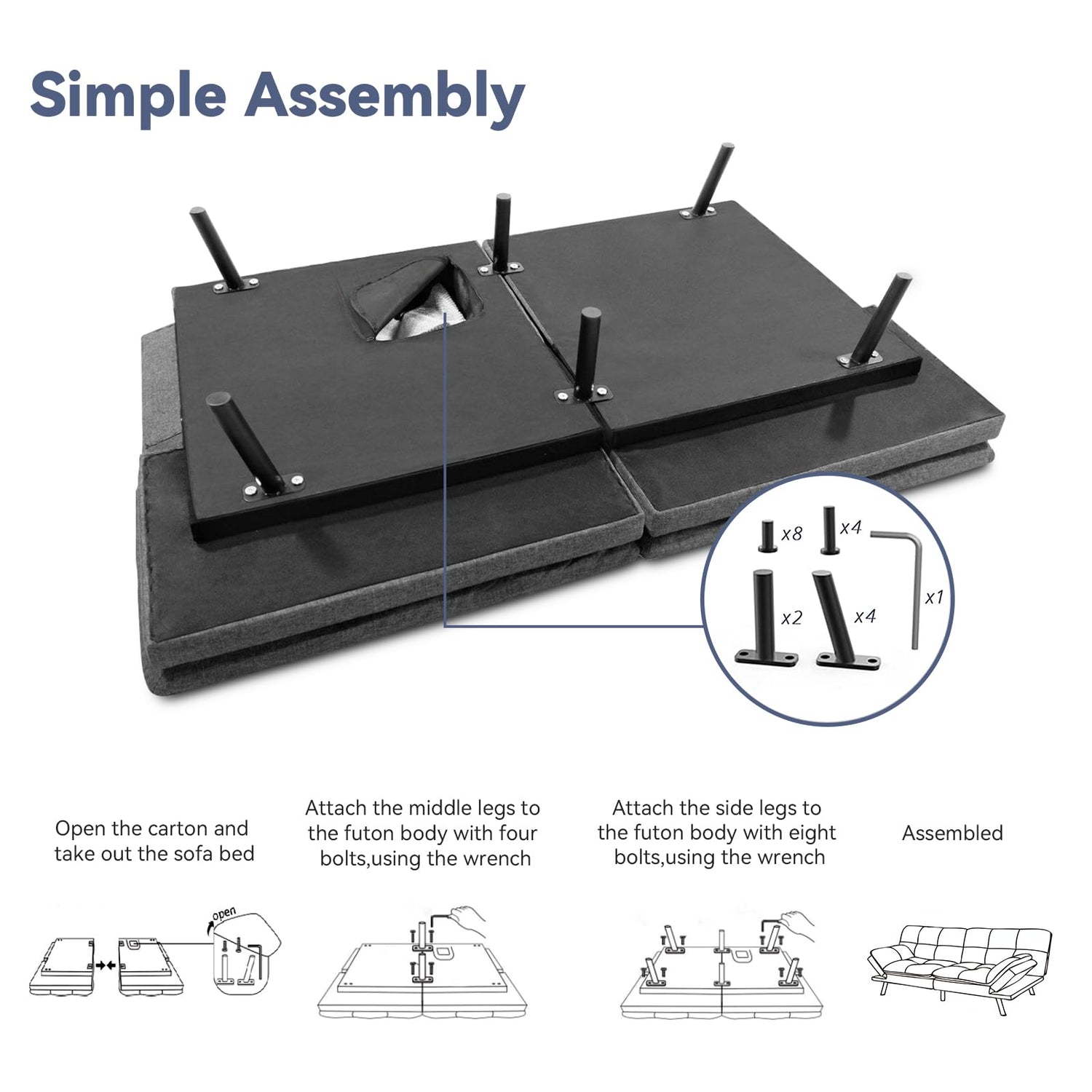 - 【Easy Assembly】: Our futon bed is easy to assemble and comes with simple installation instructions,you can easily assemble it in 15 minutes.Note:The sofa legs are placed in the pocket at the bottom of the sofa, making it easy to find and assemble. The memory foam will loosen after 2 hours and become comfortable after 12 hours.