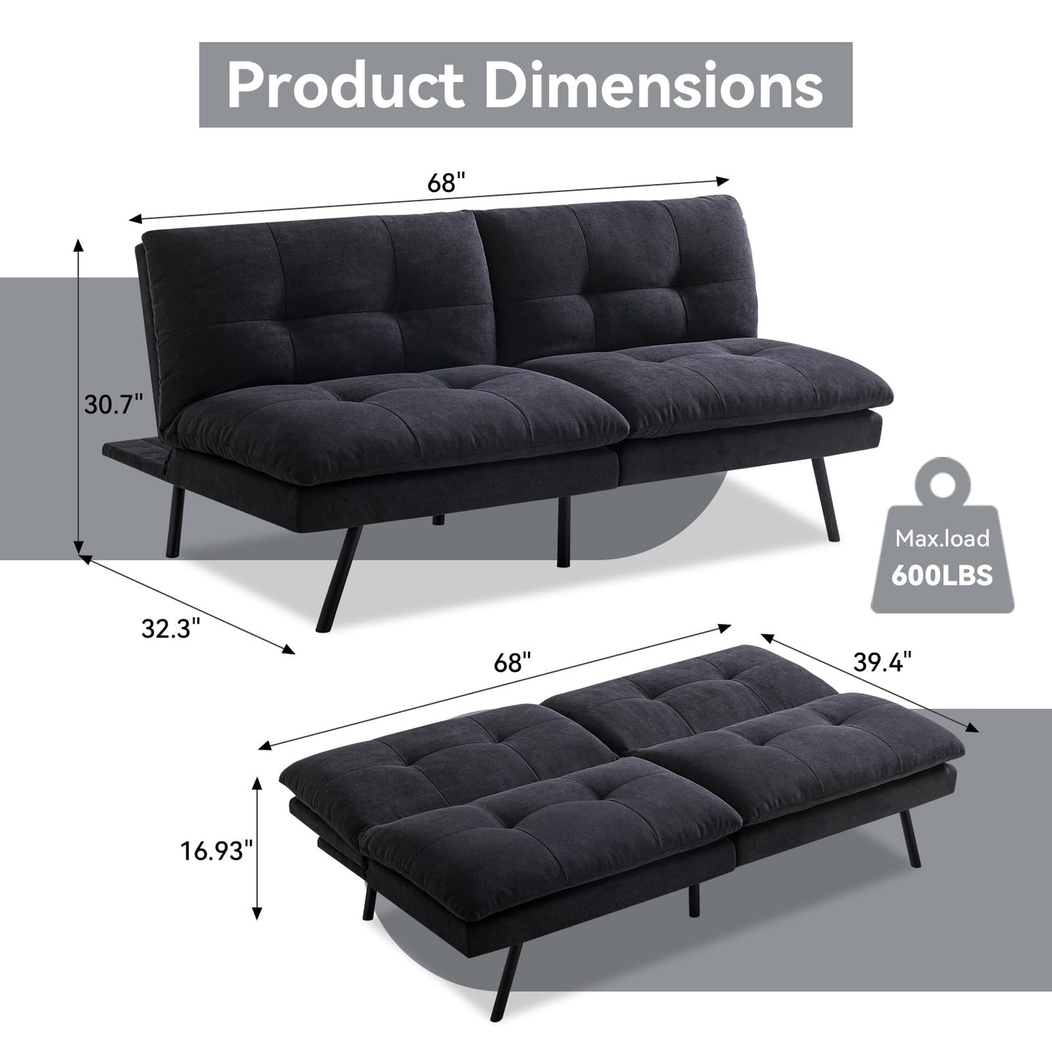 - 【Conversion Function】:The futon sofa size :68"(L) X 32.3"(W) X 30.7"(H).Sleeper bed size :68"(L) X 39.4"(W) X 16.93"(H); Weight Capacity:600 pounds.This sofa is as a cozy couch and quickly turns into a bed when you're sleepy, making it a practical addition to any home,ensuring it can withstand everyday use for years to come.