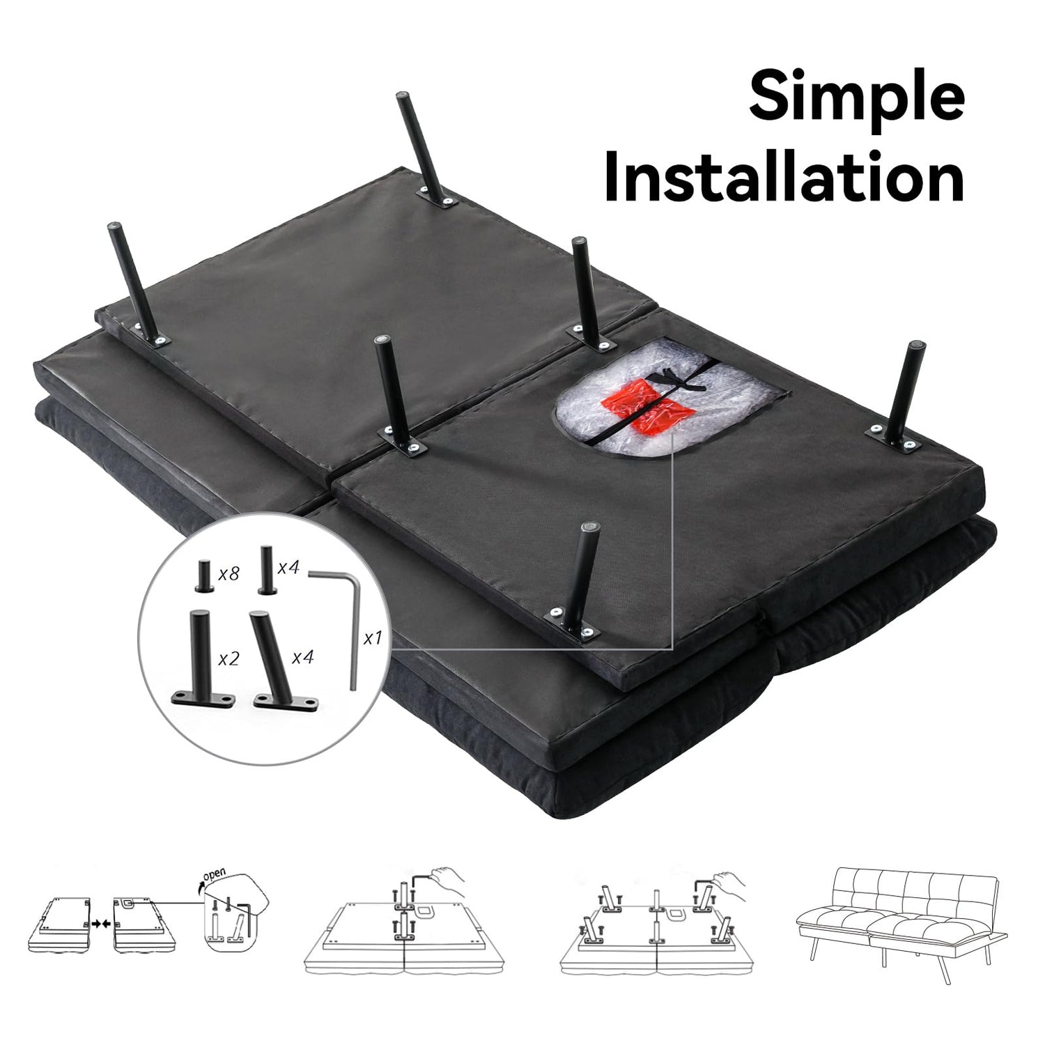 - 【Assemble Easily】:Modern convertible futon sofa bed is delivered to your home in a box that can be assembled quickly according to the assembly instructions with 6 metal legs with protective cover more solid and stable. Note: All accessories are in the zippered pocket on the bottom of the sofa loveseat.