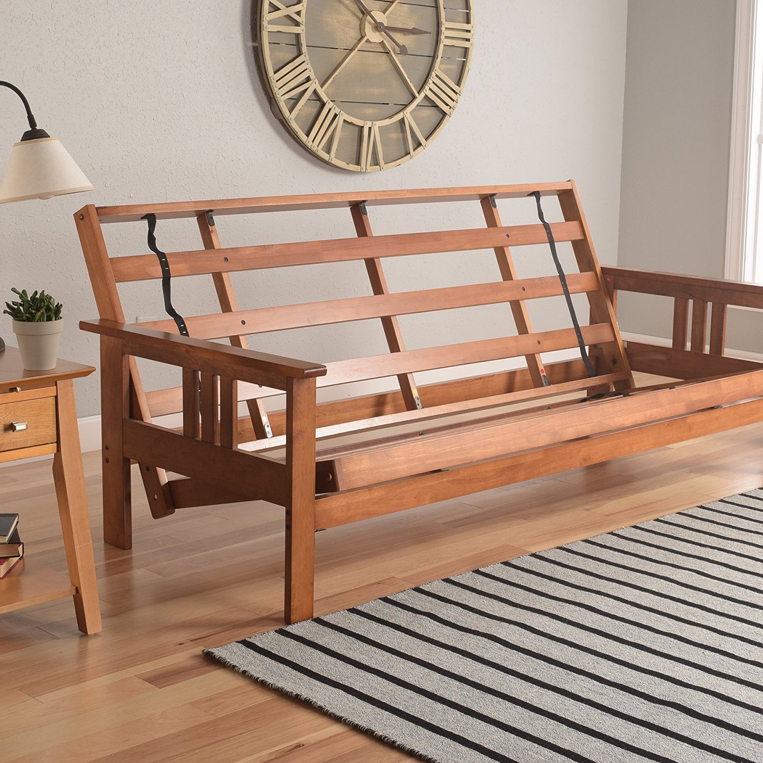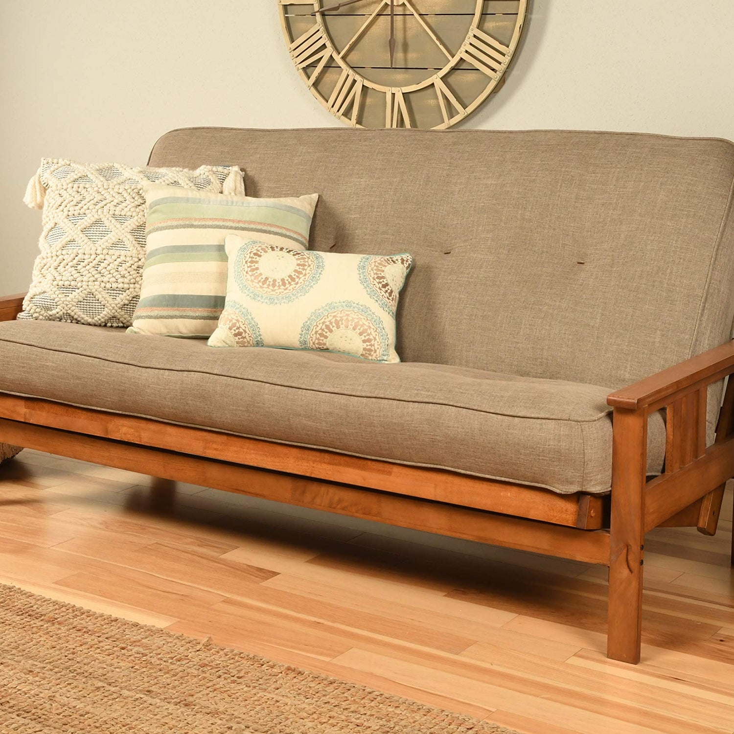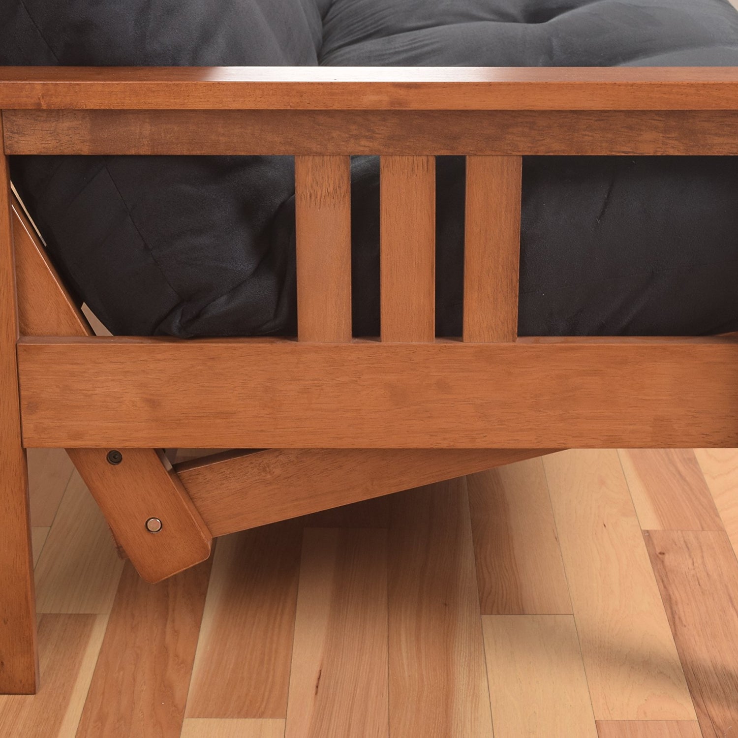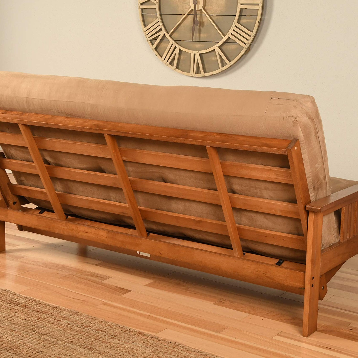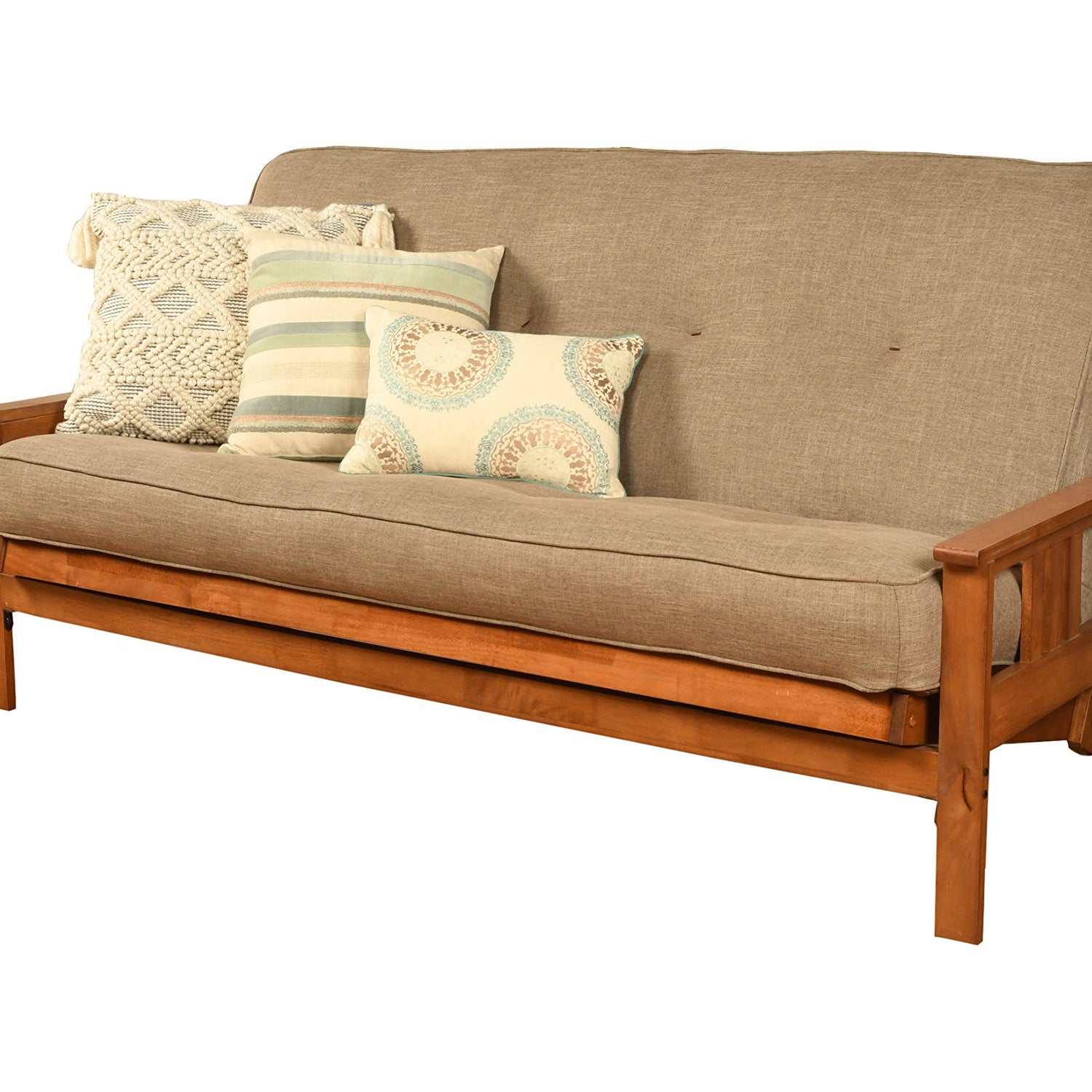 Details: The Monterey futon features a classic hardwood frame with Mission style arms. This unique and versatile full-size futon sofa easily converts to a bed. This multifunctional piece of furniture can find a home in just about any type of room. The included mattress measures 75" L x 54" W x 8" H and has 276 coil hinged springs for extra comfort. Maximum distributed weight: 500 pounds.