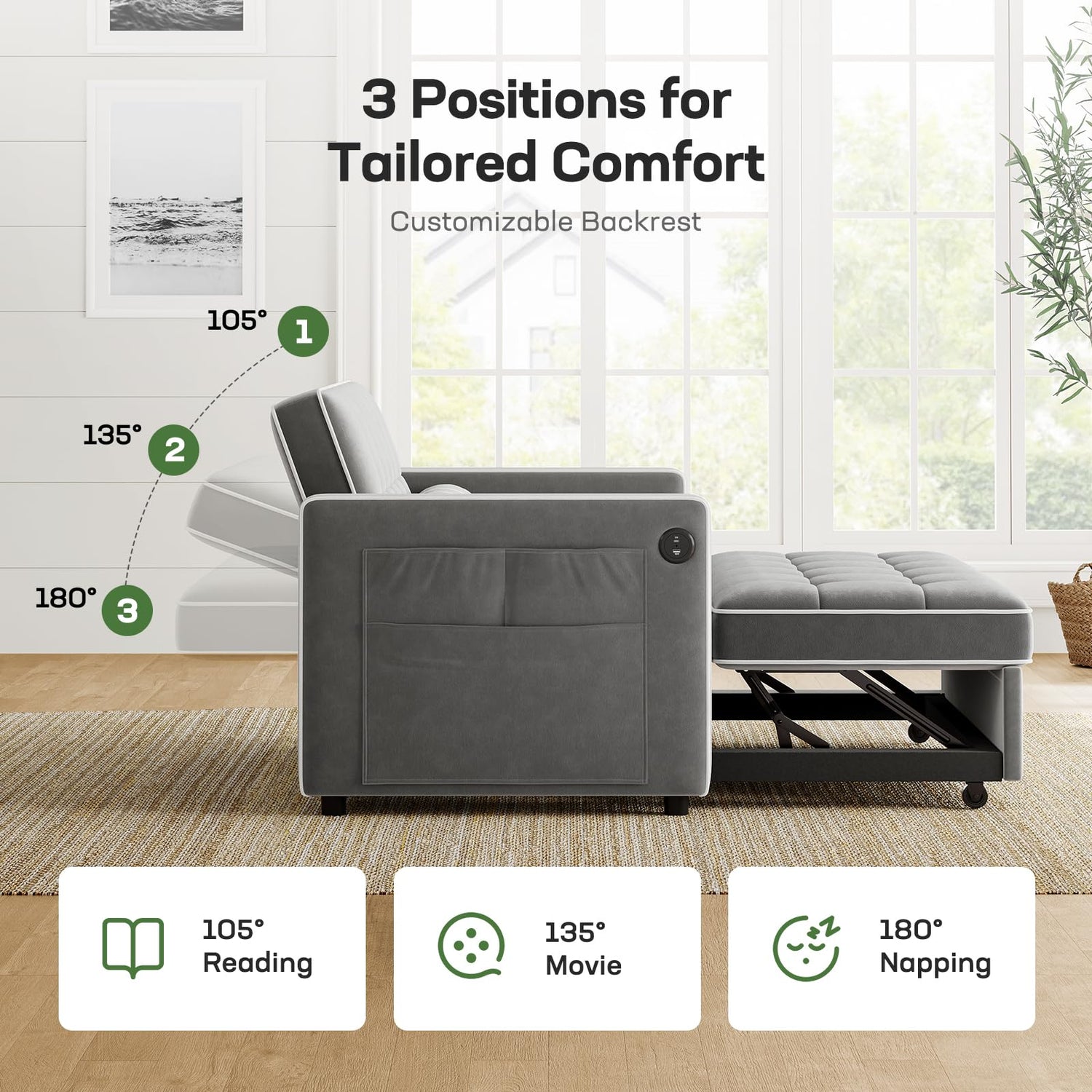 Marsail 3-in-1 Convertible Futon Sleeper Sofa Bed, Pull Out Couch with Adjustable Backrest, USB Charging & Side Pockets, Velvet Fabric Sofa for Living Room, Apartment, Loveseat, Grey