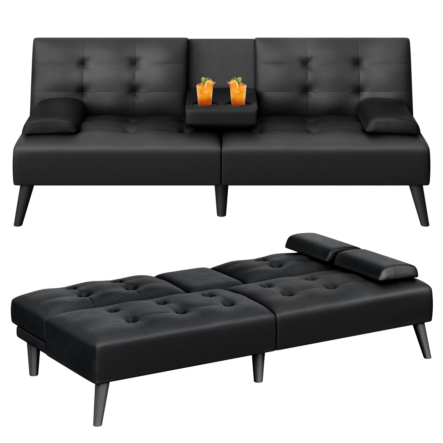 Meilocar Convertible Futon Sofa Bed Couch, Modern Folding Futon Set, Adjustable Recliner Sofa Bed for Living Room, 2 Cup Holders, Removable Armrest, 3 Angles (PU Leather, Black)