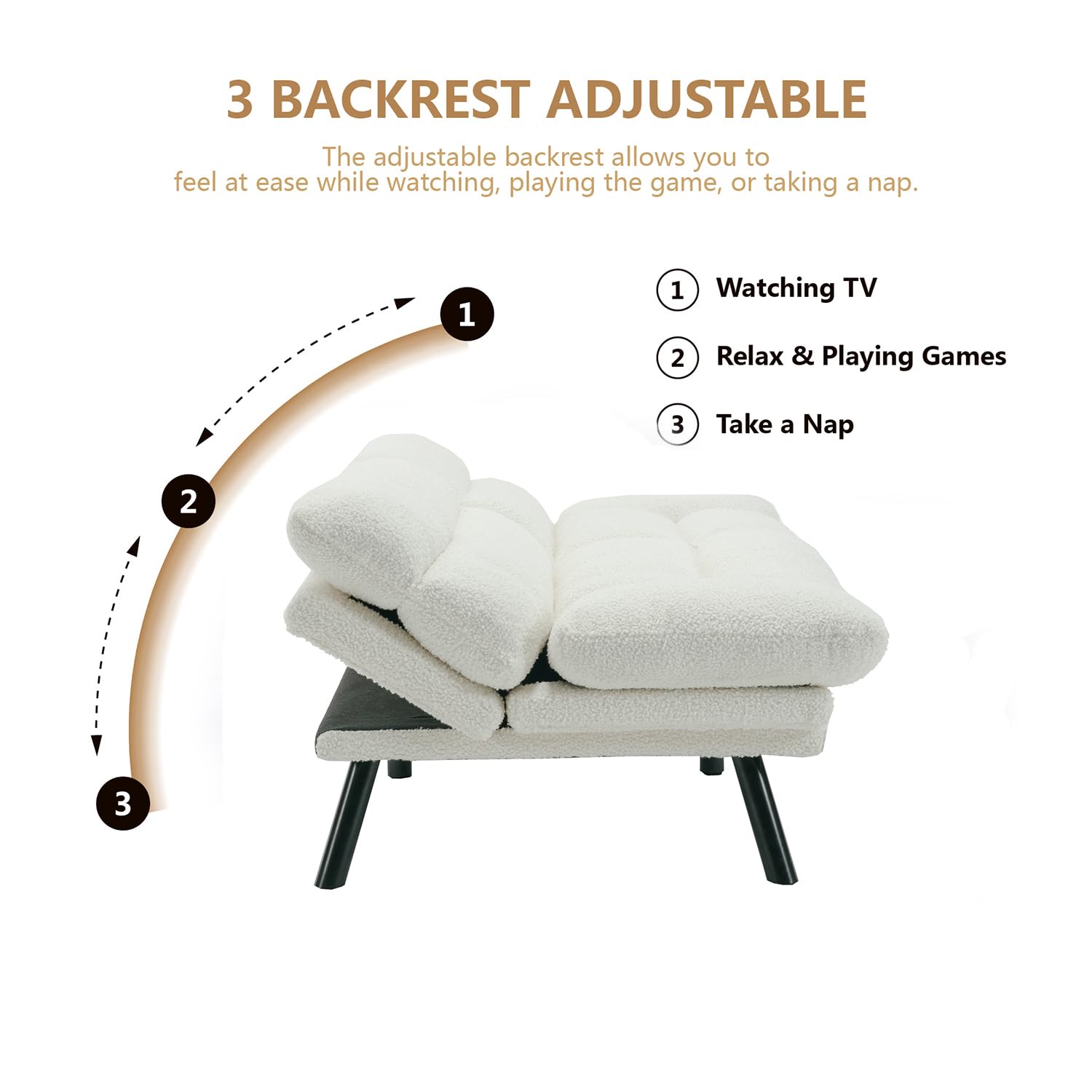 Modern Teddy Velvet Convertible Folding Futon Couch Sofa Bed Adjustable Pillow Top Arm Memory Foam Couch Double Loveseat Sofa for Compact Living Space,Dorm,Game Studio,Apartment,Bedroom (White Teddy)
