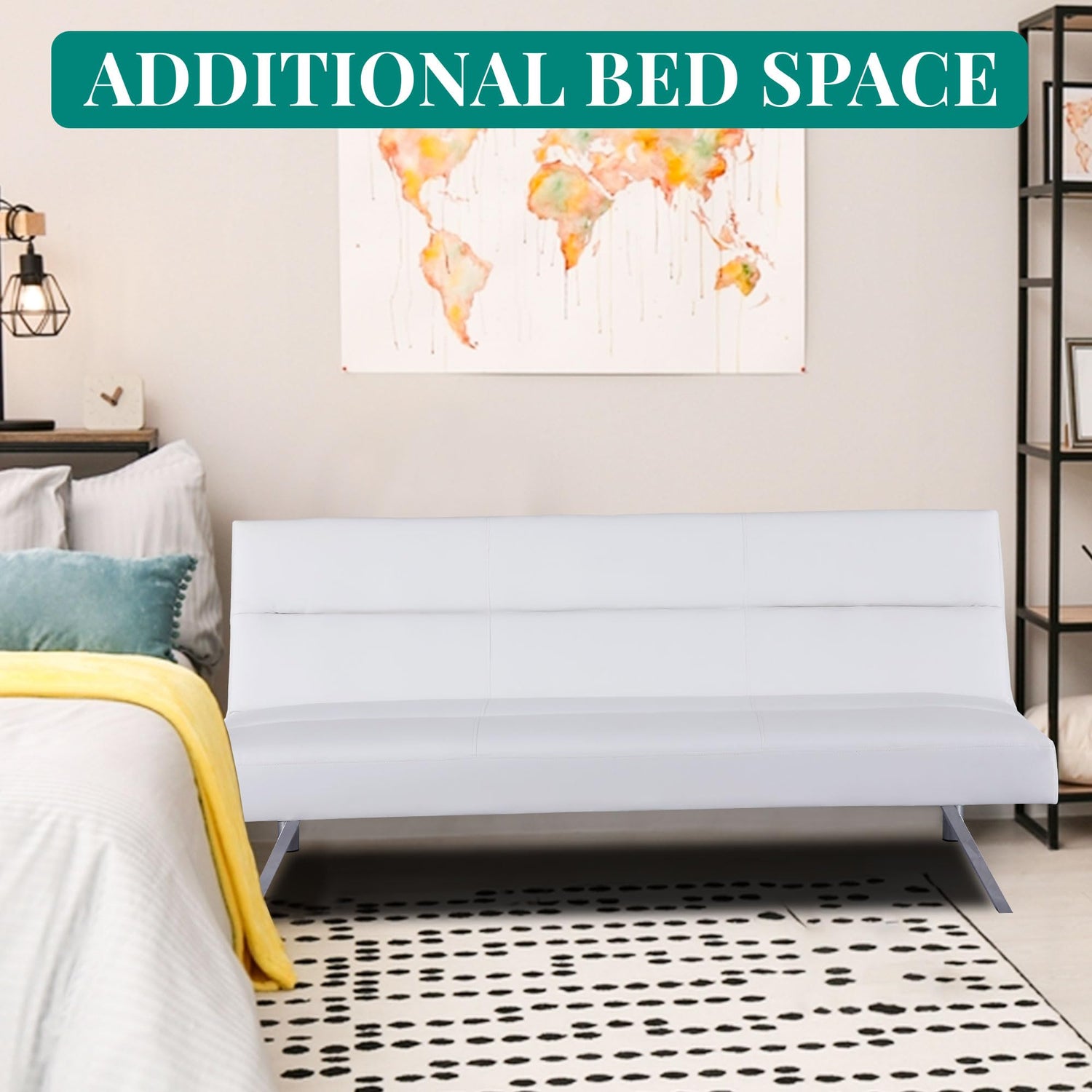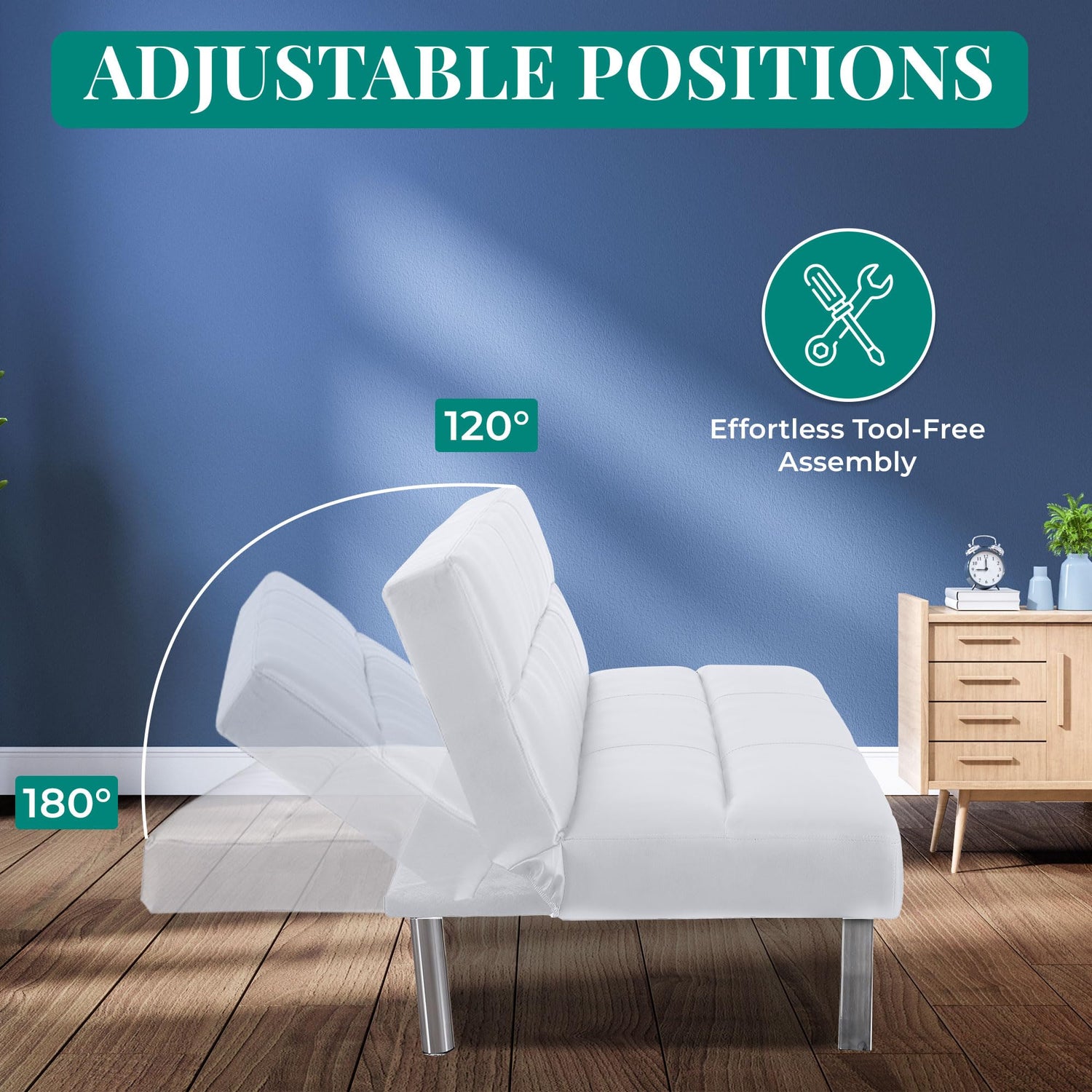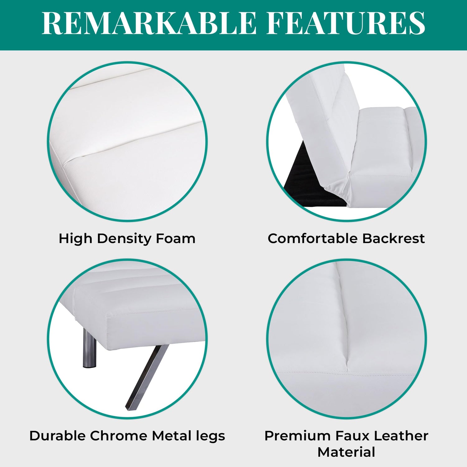 Naomi Home Faux Leather Futon Couch, Modern Convertible Folding Sofa Bed Couch Futon Sofa Bed with Chrome Legs, Reclining Mini Couch, Leather Futon Small Couch for Bedroom Living Room White