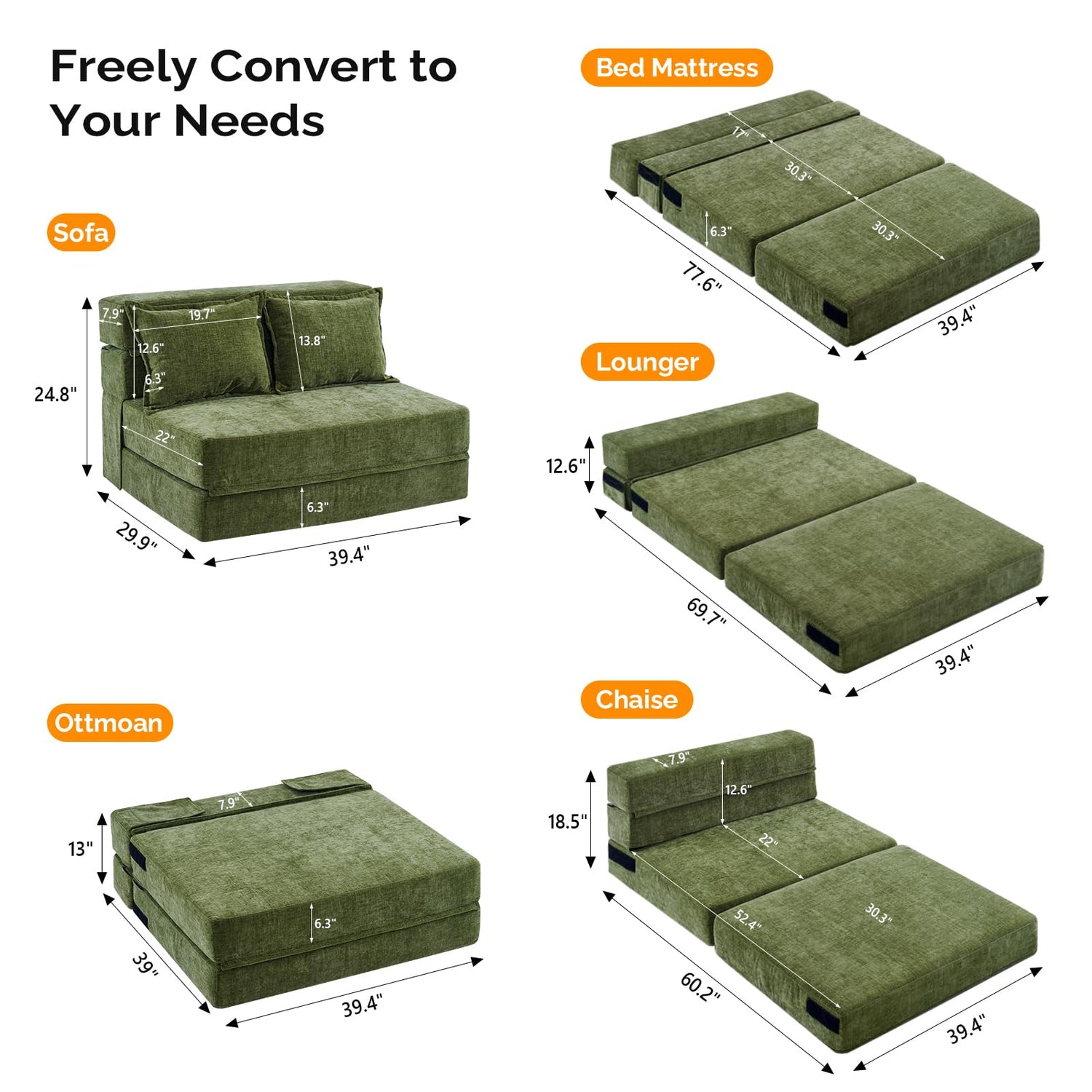• Freely Convert to Your Needs--Includes 2 throw pillows. This foldable sofa bed effortlessly converts into a floor couch, chaise lounger, mattress, or ottoman, catering to your diverse needs. Perfect for RV, camping trips, sleepovers, and vacations