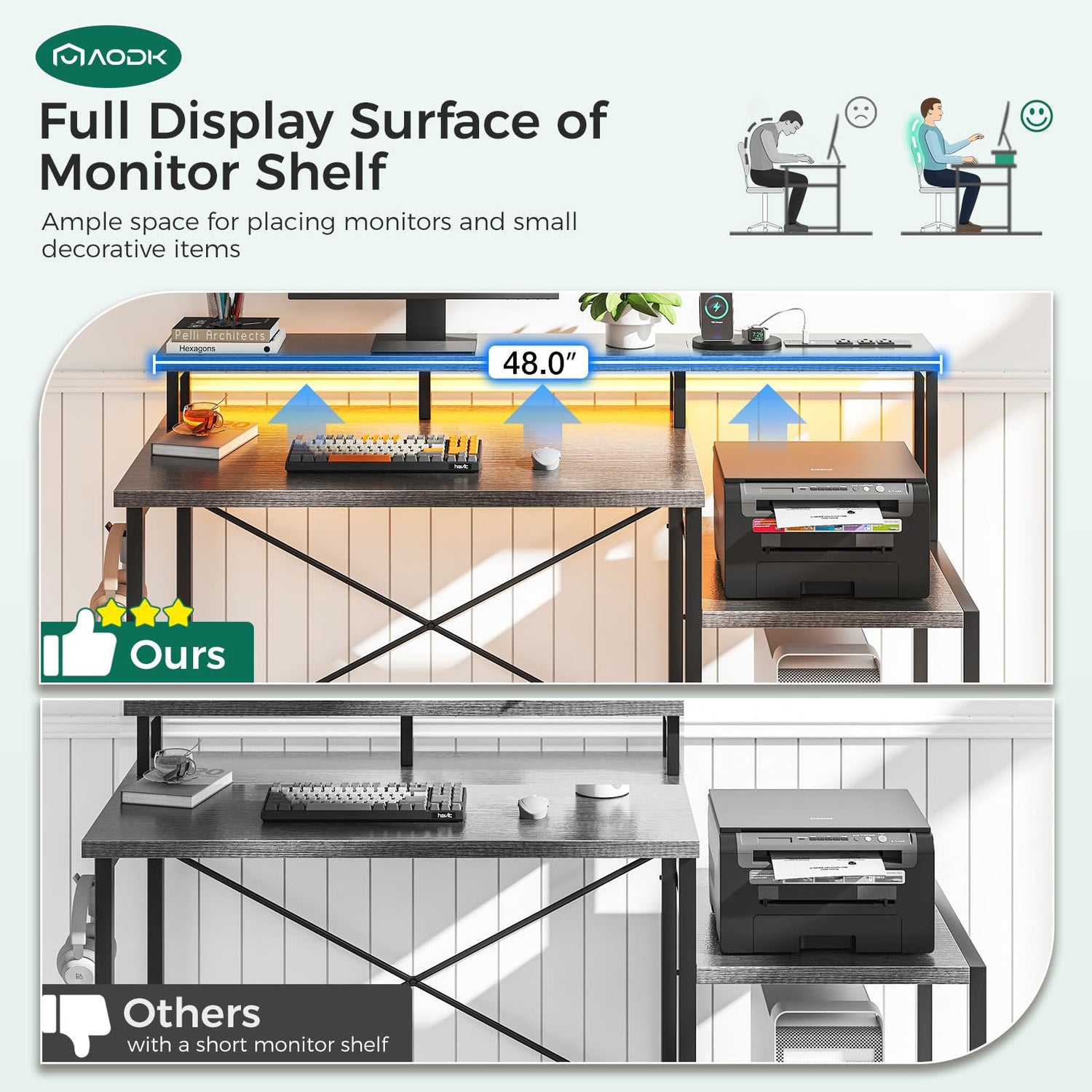 AODK Computer Desk, 48 Inch Gaming Desk with Led Lights & Power Outlet, Office Desk with Printer Storage Shelves, Reversible Desk with Monitor Shelf & Headphone Hook, Grey Oak