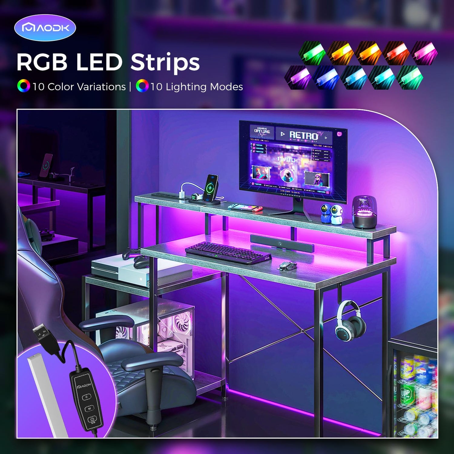 - ✔Desk with LED Lights: This computer desk is equipped with a LED light strip under its monitor shelf, which can provide 10 static colors and 10 dynamic modes for your selection. By using different colors and brightness, you can create different light effects and ambiance to add a personalized style to your work or gaming area.