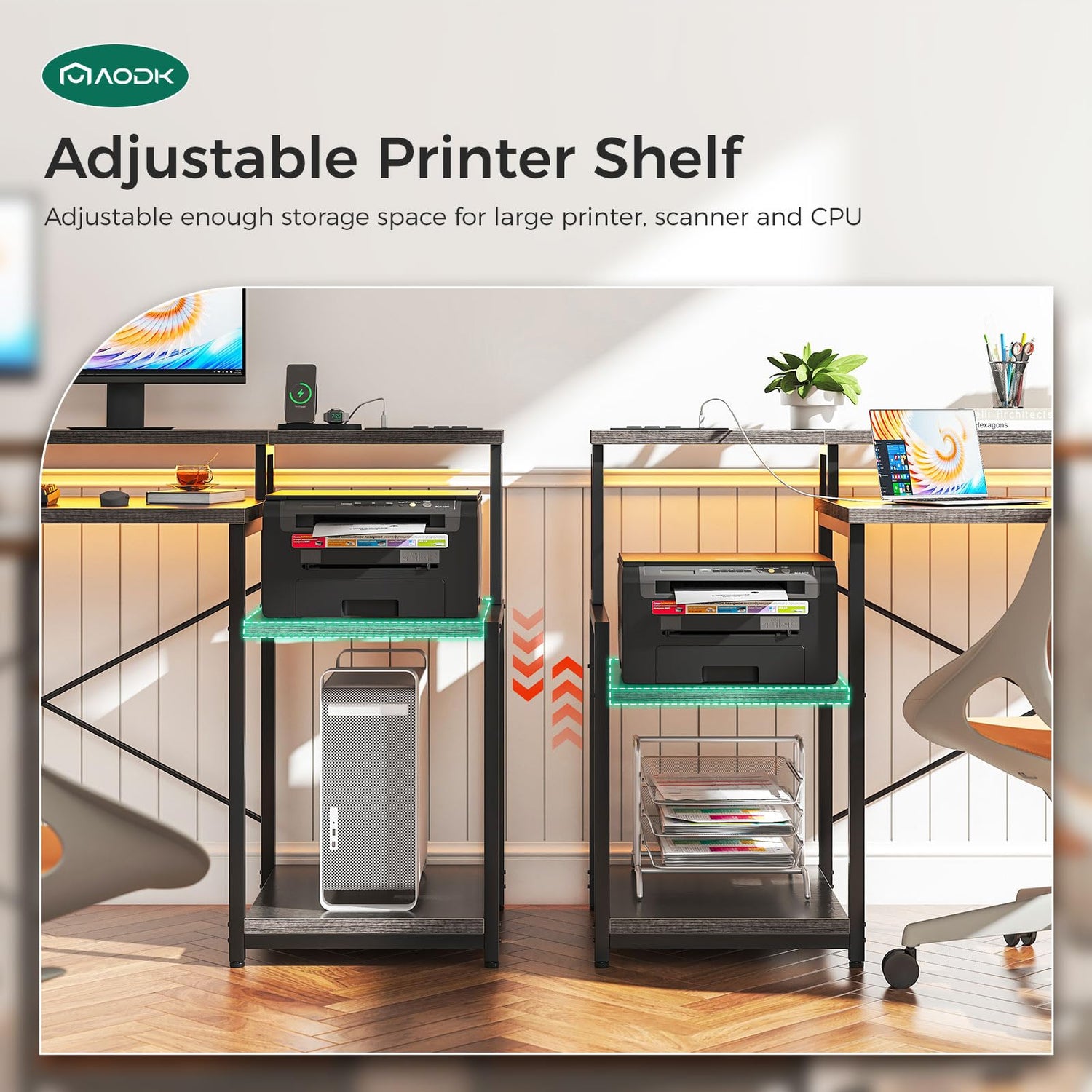 - ✔Reversible & Adjustable Printer Shelf: This office desk is designed with a reversible and adjustable storage shelf. You can install the shelf on the left or right based on your preference. Plus, the upper shelf can be adjusted to two different heights according to your usage needs. You can place a big printer or scanner on the shelf and place a tall CPU or a low file basket under the shelf. A headphone hook is equipped on the other side of the desk.