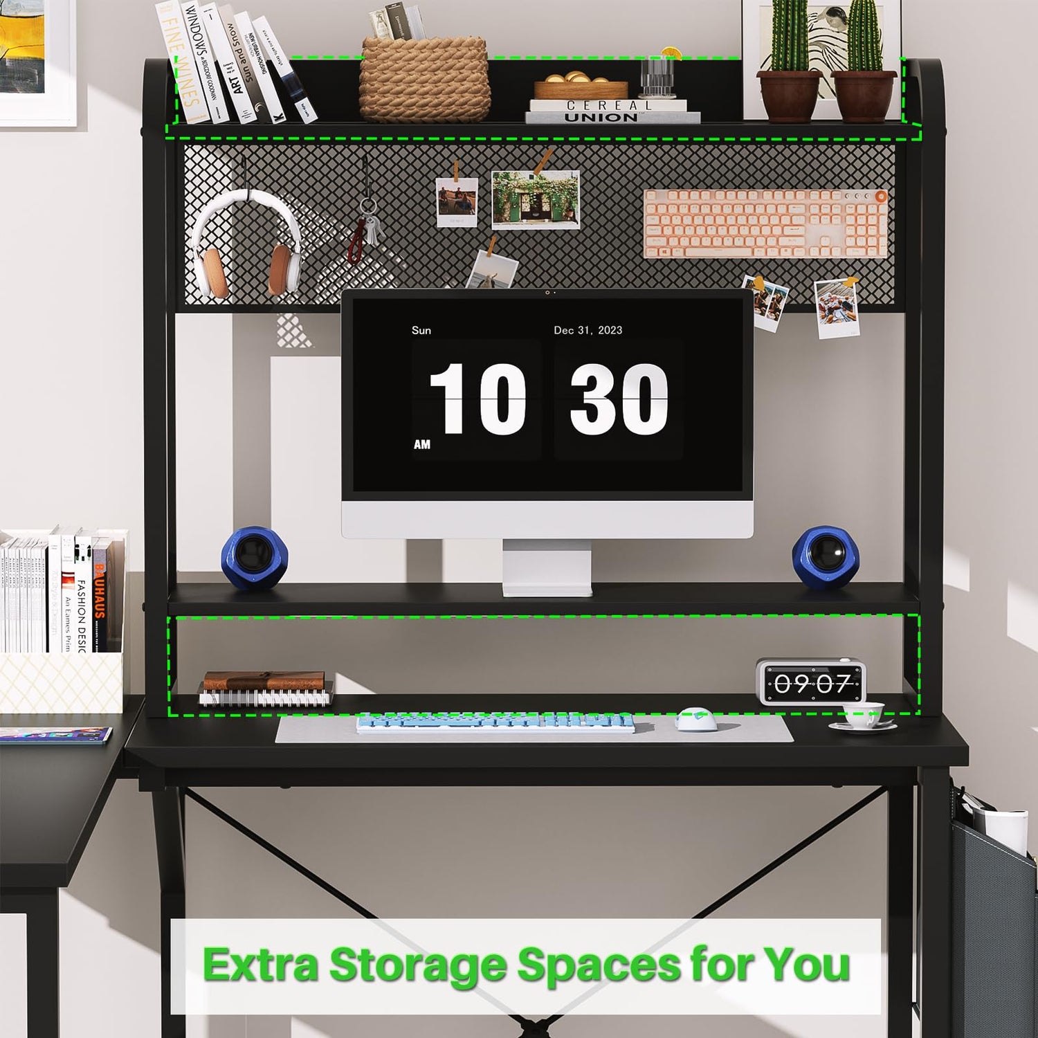 - **Corner Desk with Hutch**: The desk includes a hutch and an adjustable height monitor stand, you can install it on either the left or right side to fit your space perfectly. The hutch and monitor stand provide extra storage space for your accessories and documents. The height-adjustable monitor stand promotes a healthy sitting posture, helping to prevent neck and shoulder discomfort during long hours of work or study