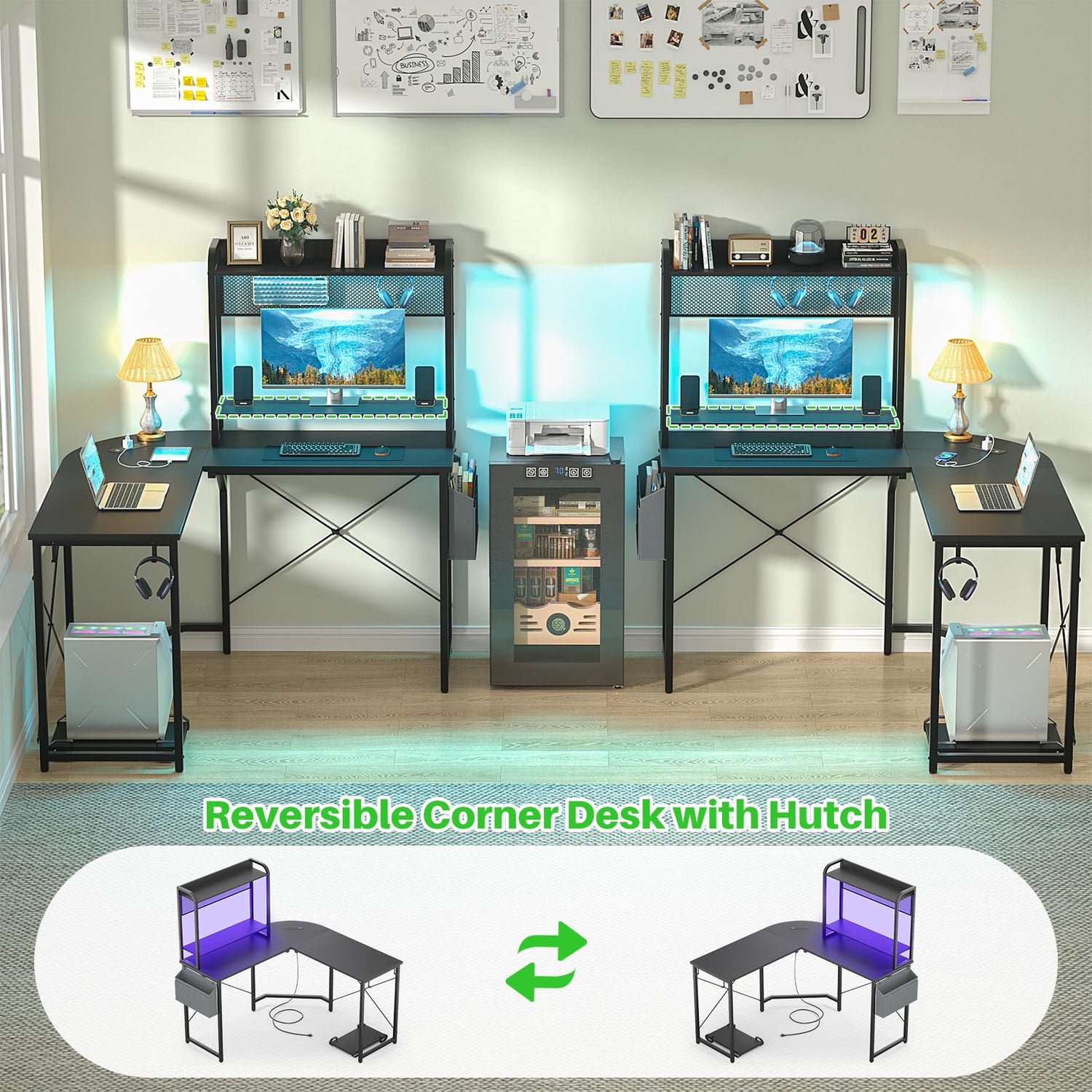 Besiost L Shaped Desk with Hutch, L shaped Computer Desk with Power Outlet and LED Lights, Reversible Corner Gaming Desk with Monitor Stand, L Shaped Desk Home Office Desk with Storage Bag, Black