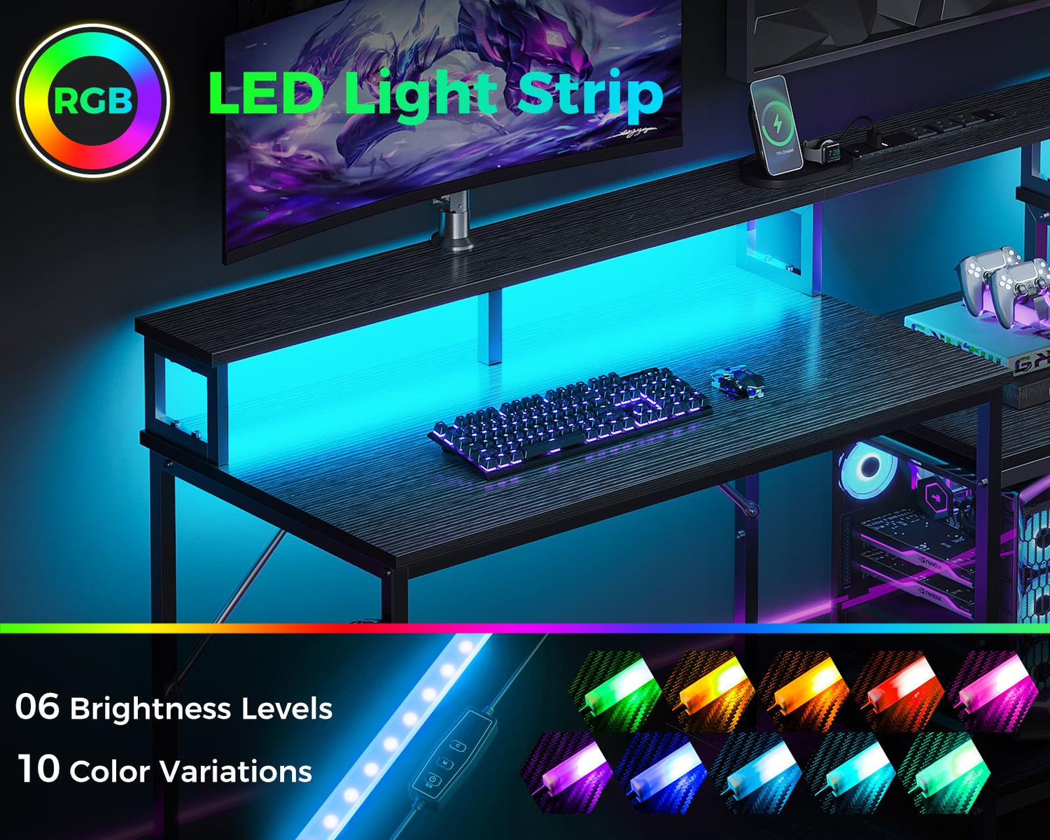 • 【Ergonomic Full Monitor Stand with Cool LED Strip】The monitor stand can effortlessly raise 2 monitors to a suitable height, giving you a more ergonomic viewing angle and reducing your strain. It also creates extra desktop storage space for a neater desktop. The LED strip contains 10 static colors, 10 dynamic modes, 6 brightness grades and memory function . You can easily switch the lights to the mode you want to create a comfortable work, study and gaming space with a great atmosphere.
