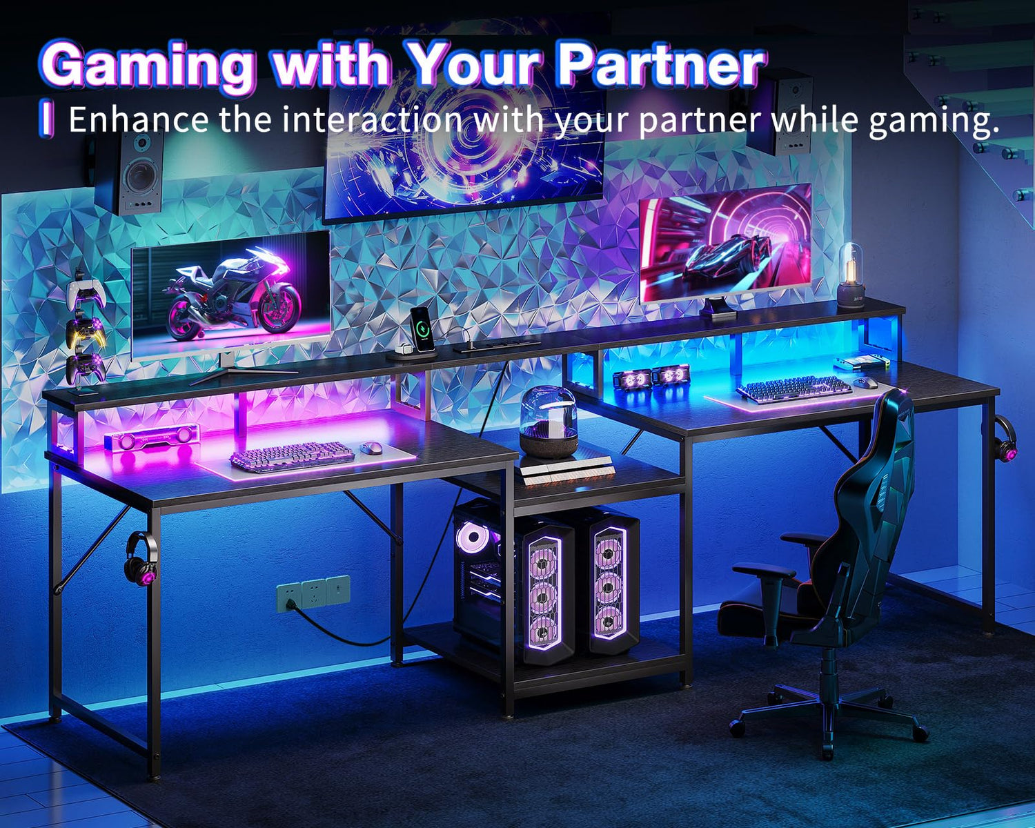 Coleshome 98 Inch 2 Person Gaming Desk with Storage Shelves- Long Double Home Office Computer Desks with USB Charging Port & LED Lights, Writing Desk with Monitor Stand, Modern Study/Work Table, Black