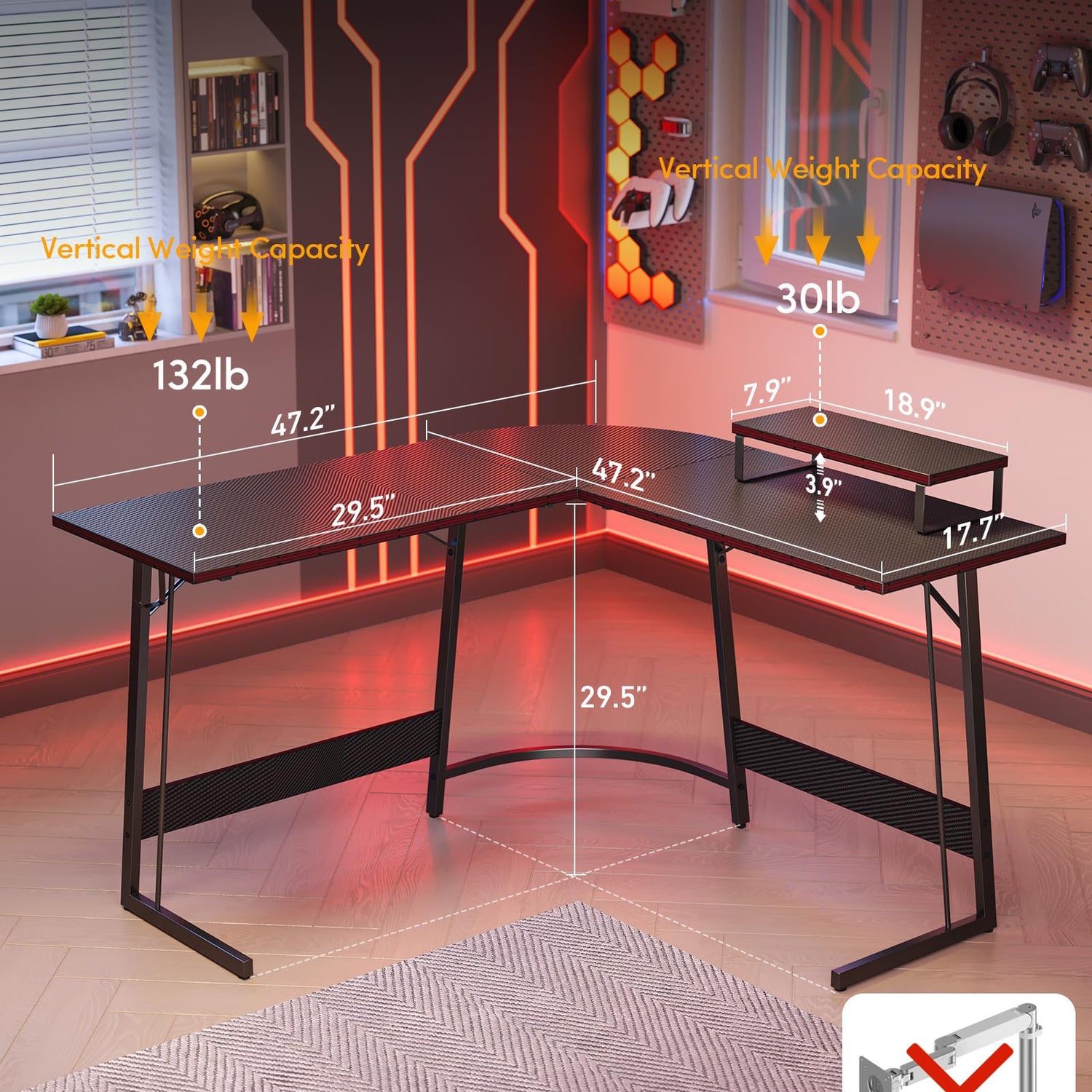 CubiCubi L Shaped Gaming Desk Computer Office Desk with Carbon Fiber Surface, 47 inch Corner Desk with Large Monitor Stand for Home Office Study Writing Workstation, Carbon Fiber Black
