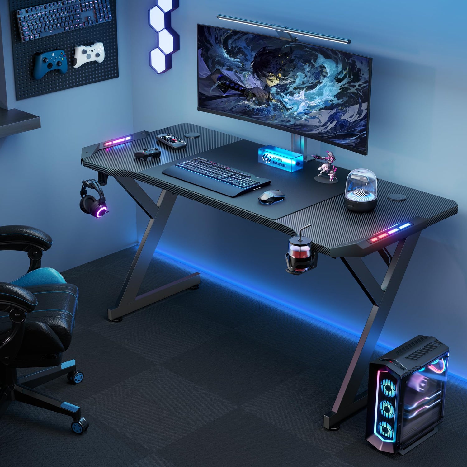 HLDIRECT 55 Inch Gaming Desk with LED Lights, Ergonomic Computer Gaming Table with Carbon Fibre Surface, Sturdy PC Workstation Desk for Gaming and Home Office with Headphone Hook, Cup Holder, Black