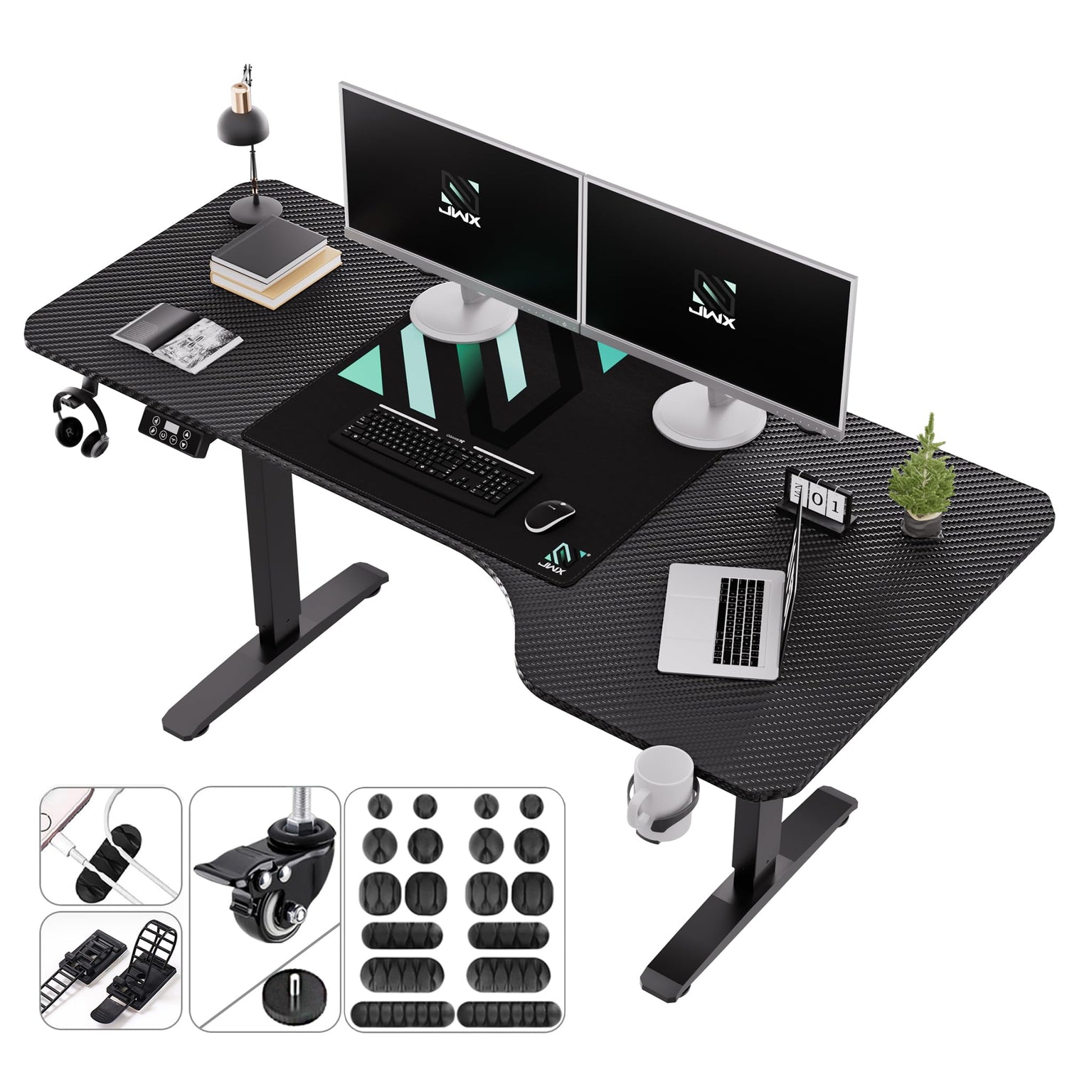 JWX Standing Adjustable Desk, 63 inches L Shaped Electric Standing Gaming Desk with Locking Wheels, Cup Holder, Headphone Hook, Cable Manager, Mouse pad, Carbon Fiber Textured Pane