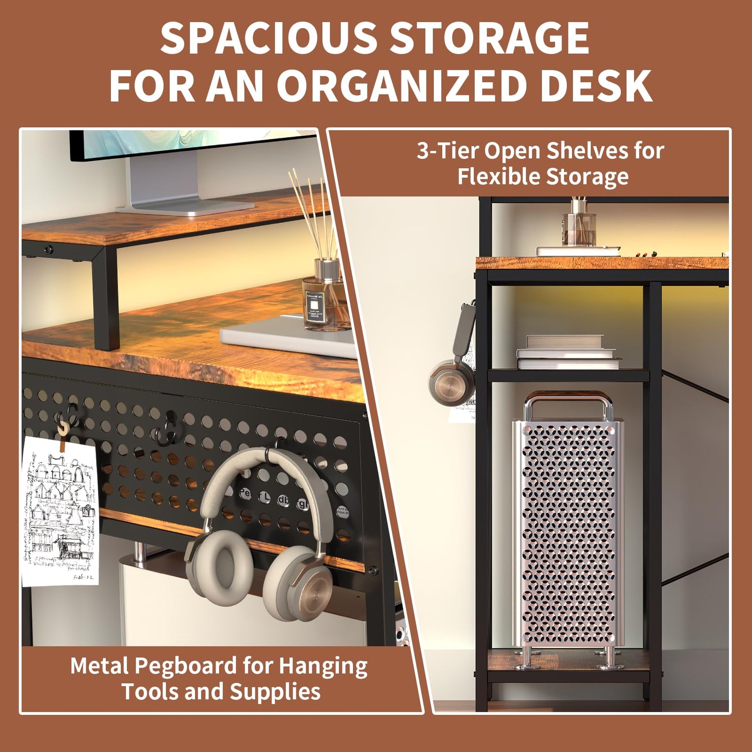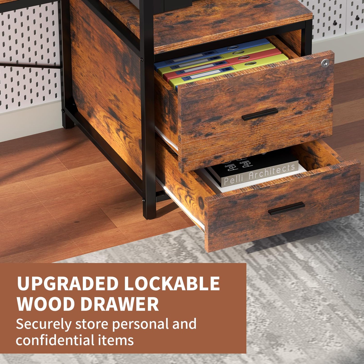 - Sturdy Wooden Storage: This wood desk features a customizable pegboard, a wooden drawer cabinet with metal support, and an under-desk PC host rack. These storage solutions help reduce clutter and maximize organization, providing ample space for accessories while preserving legroom for a clean and comfortable workspace