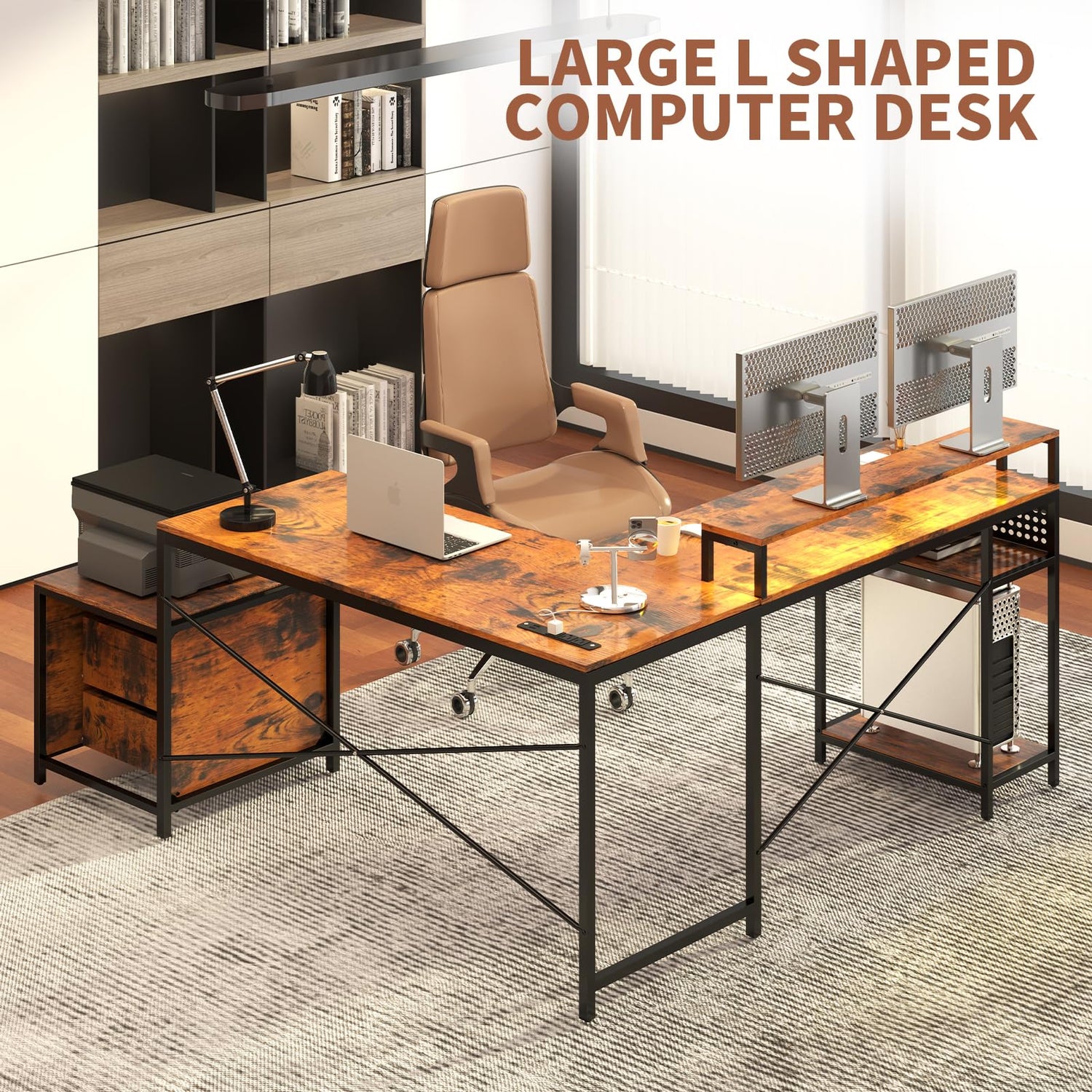 OtterOasis 66" L Shaped Desk with Wood Drawers, 113" 2 Person Desk with Printer Stand, Large Reversible L Shape Gaming Desk with Power Outlet, Brown Computer Desk with Power Outlet for Home Office