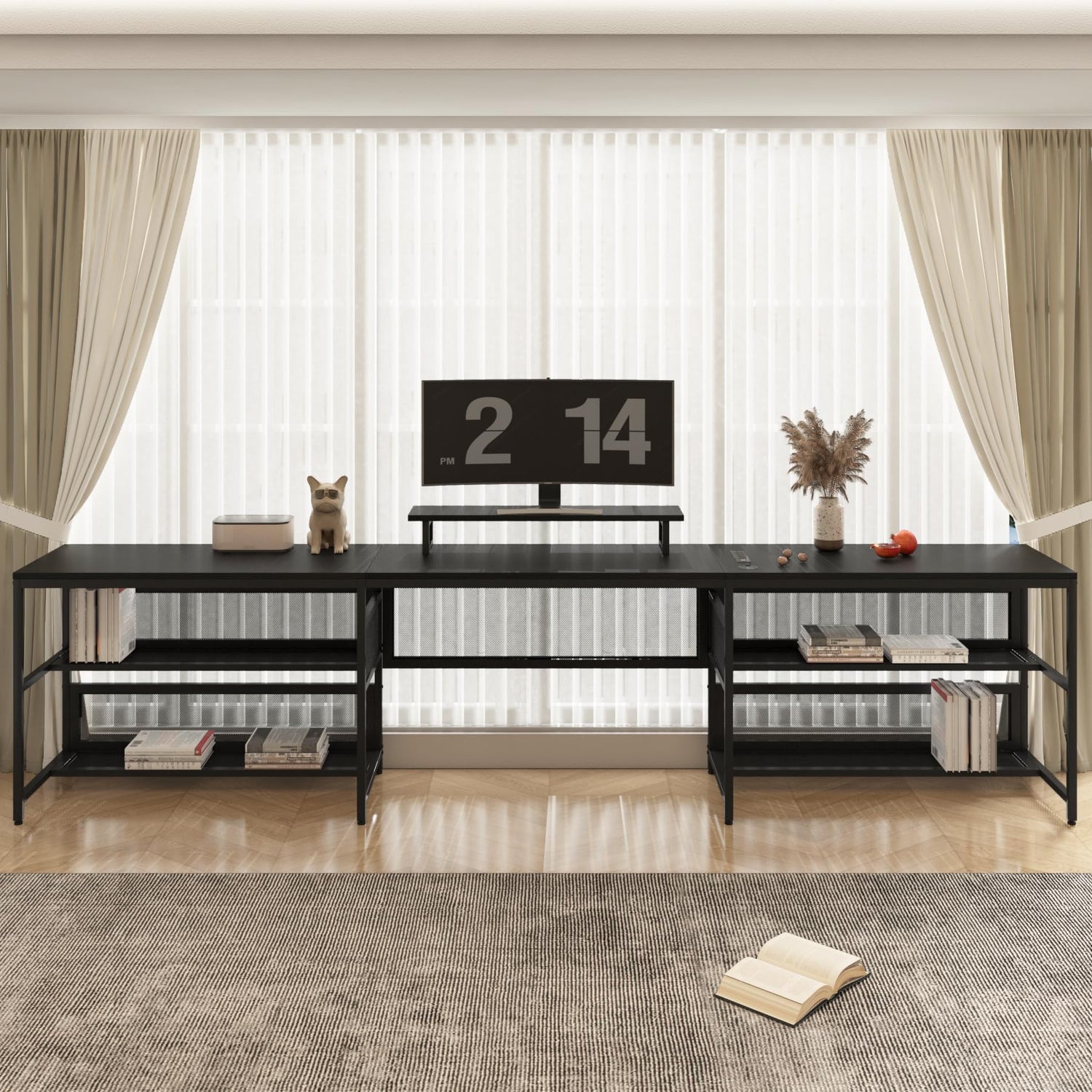- 【Convenient Storage Solutions】 Say goodbye to clutter with the four storage shelves underneath the computer desk, providing ample space to organize files, books, and other essentials. This thoughtful feature promotes a clean and tidy workspace, allowing you to focus on tasks without distractions and enhancing overall efficiency.