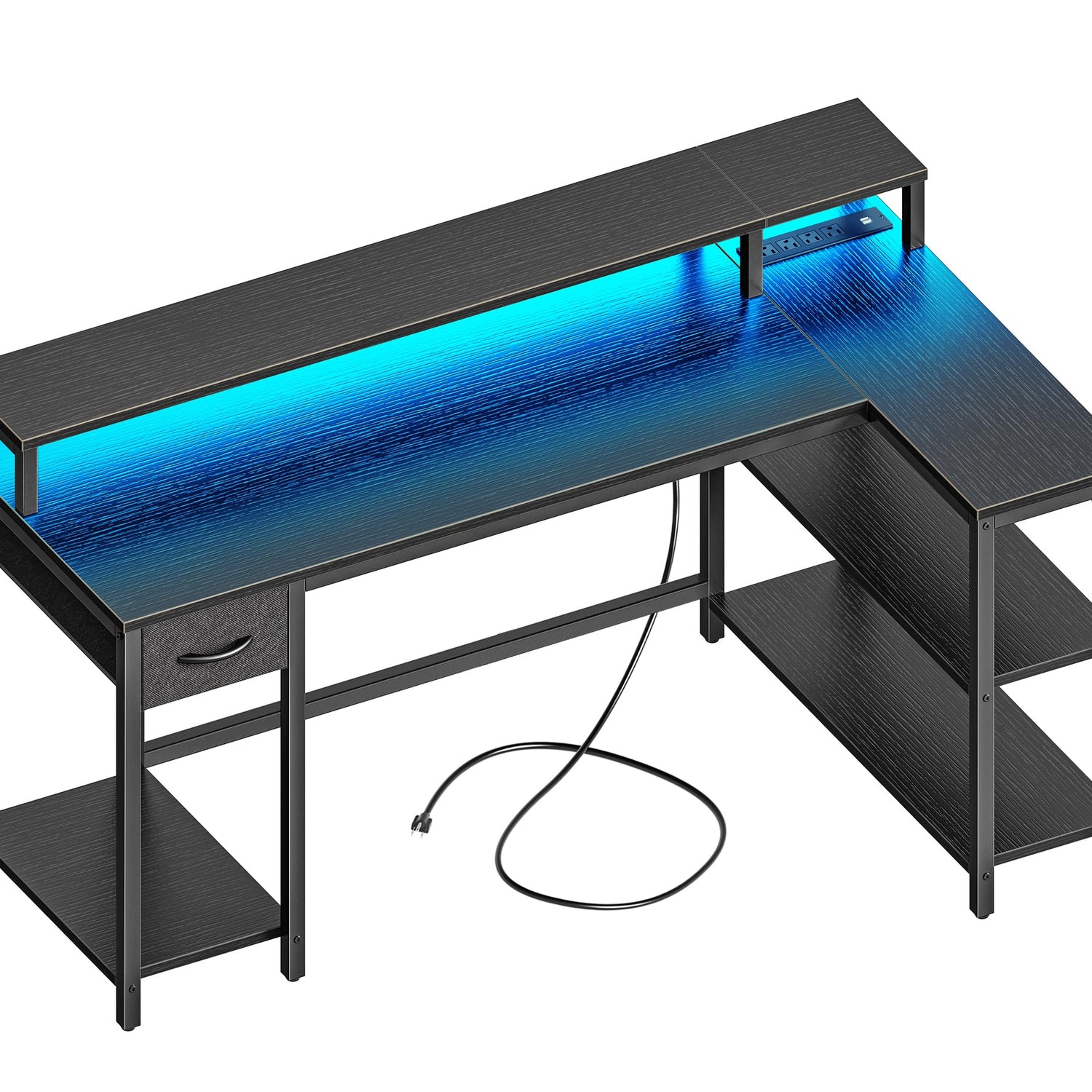 SUPERJARE 53 inch Reversible L Shaped Desk with LED Lights & Power Outlets, Computer Desk with Shelves & Monitor Stand, Gaming Desk with Drawer, Home Office Desk Corner Desk, Black