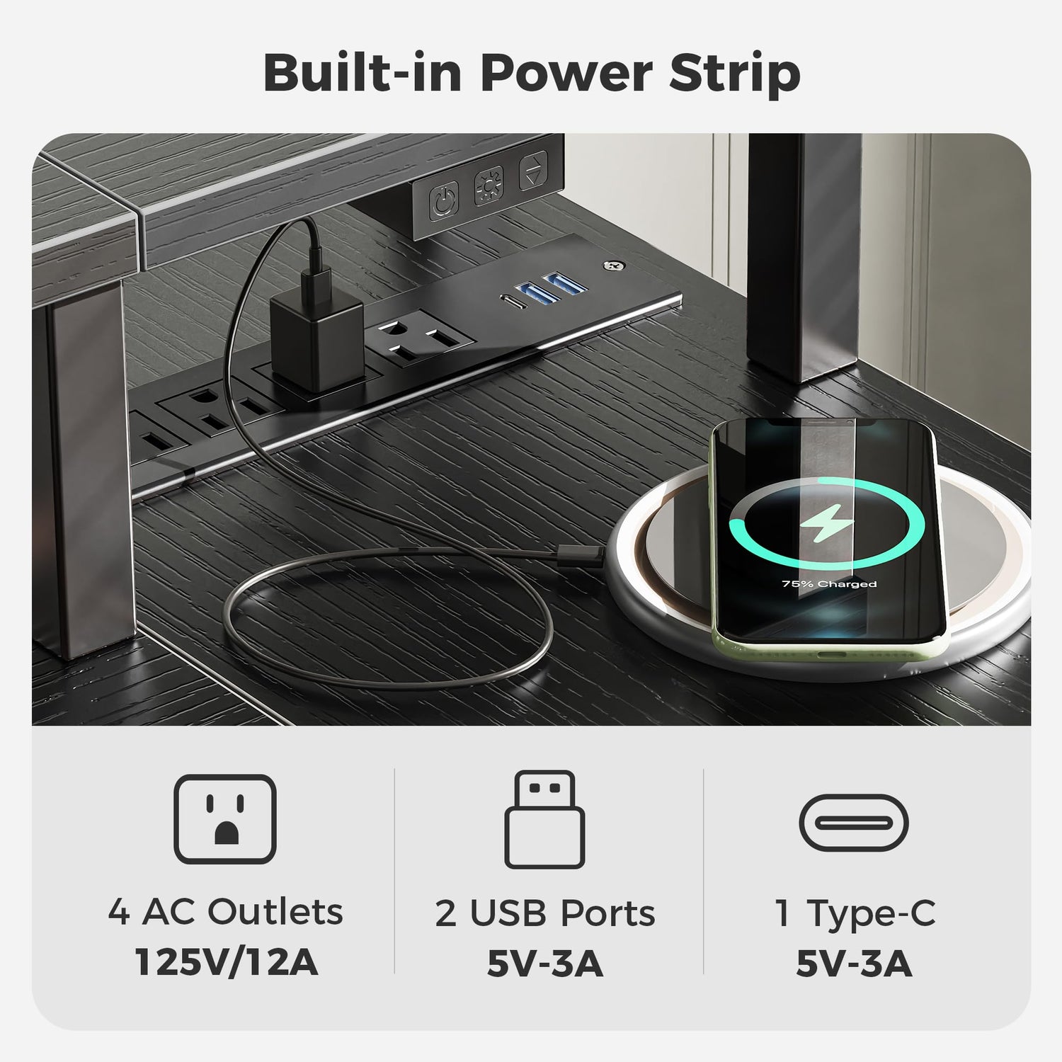 - 【Power Strips & Monitor Shelf】This computer desk is equipped with 4 Standard Plug Outlets, 2 USB Ports, and 1 Type-C port, which can easily charge phones laptops, gaming gear and other office devices. Monitor stand on the desktop elevates your line of sight, allowing you to maintain proper sitting posture and protect your cervical and spinal health.