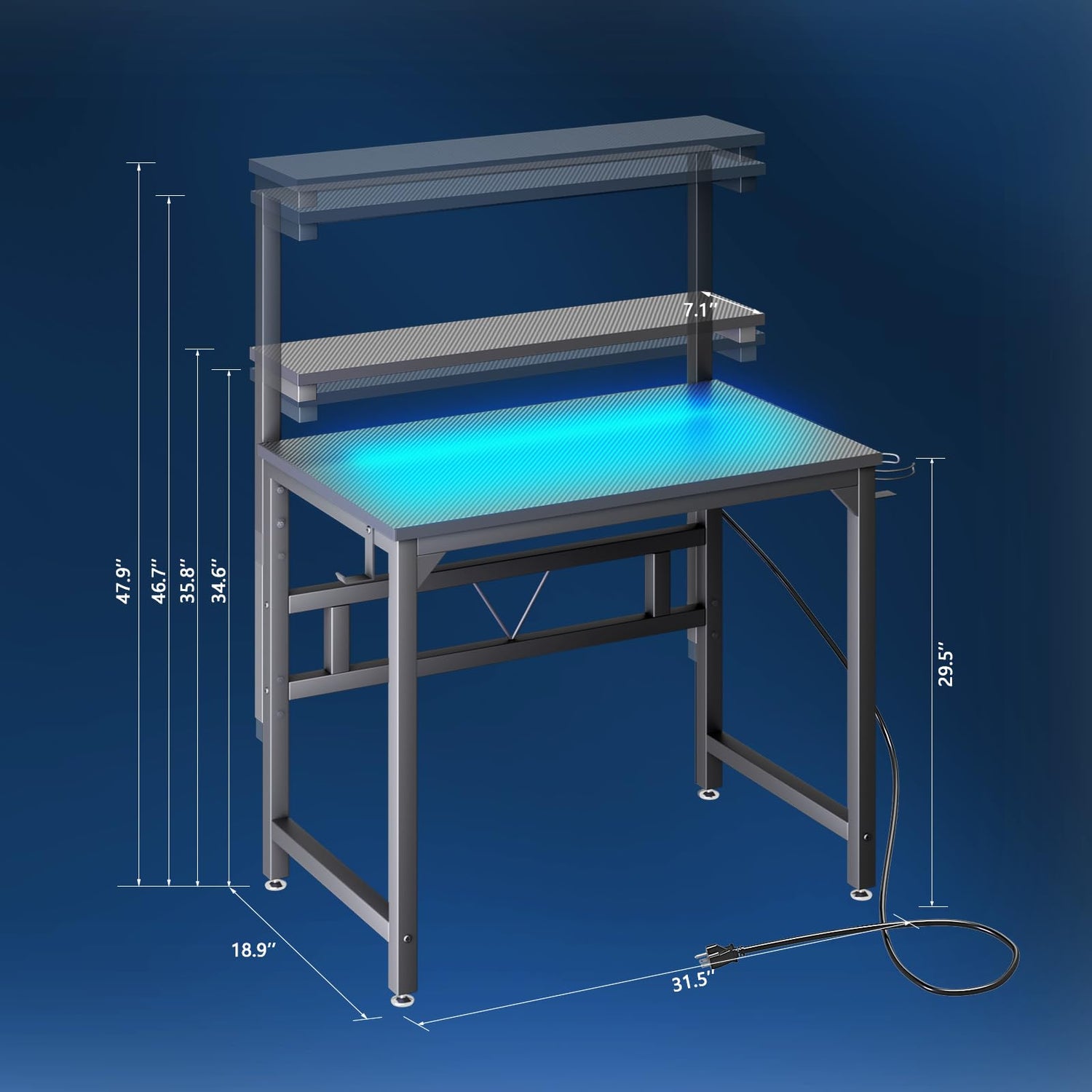 TREETALK Gaming Desk with Power Outlets & LED Strip Lights,80CM Industrial Writing Desk with Adjustable Monitor Stand, Cupholder and Headphone Hook for Home Office Black