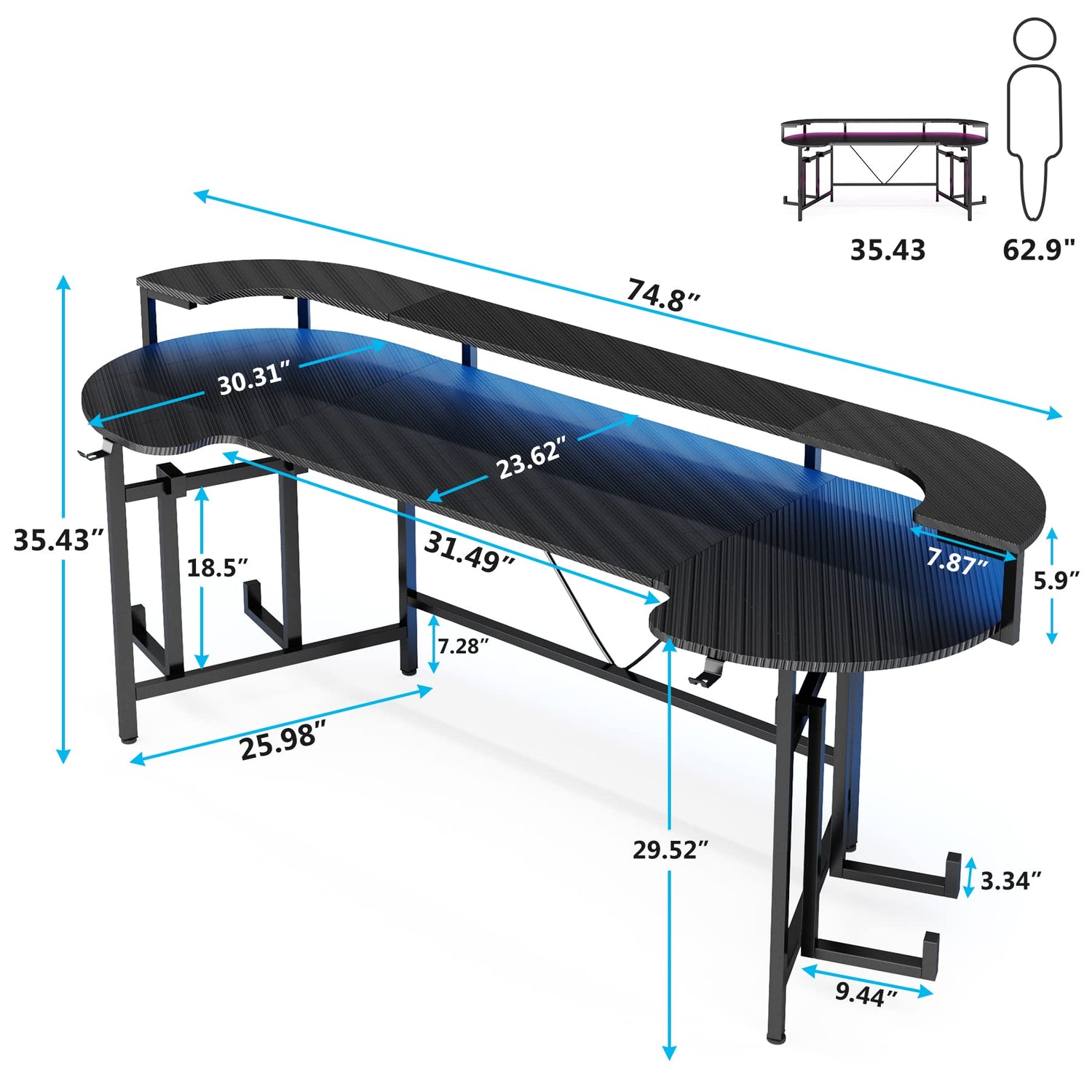Tribesigns 75 Inch Gaming Desk with Monitor Shelf, Large PC Computer Desk with LED Lights, Gaming Table Gamer Desk for Bedroom, Home Office, Black
