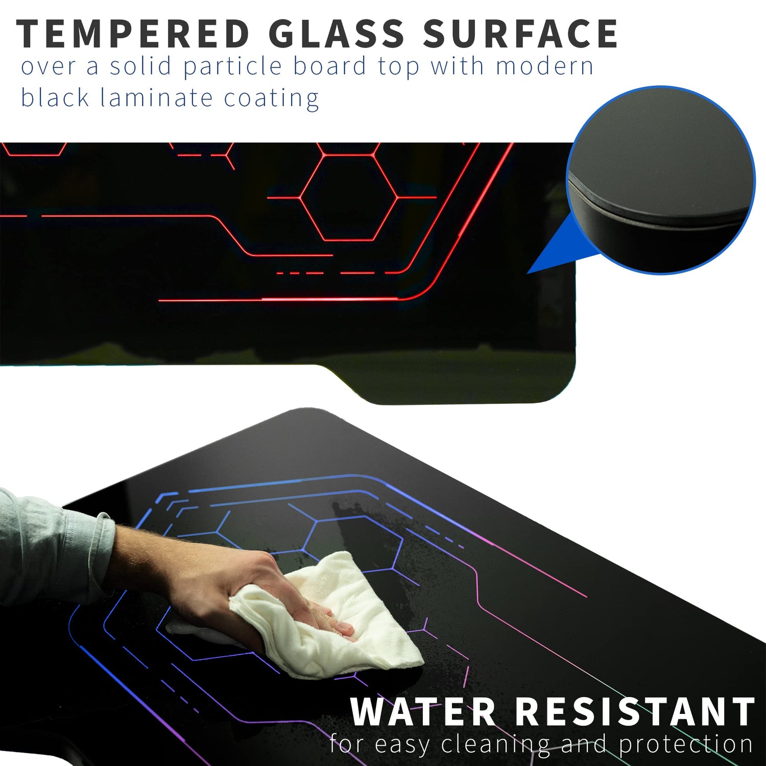 - Tempered Glass 48" Top - The 47.2" x 23.6" RGB lighting infused tempered glass top is impact and scratch resistant for long lasting use. The spacious surface provides plenty of room for a multi-screen setup.