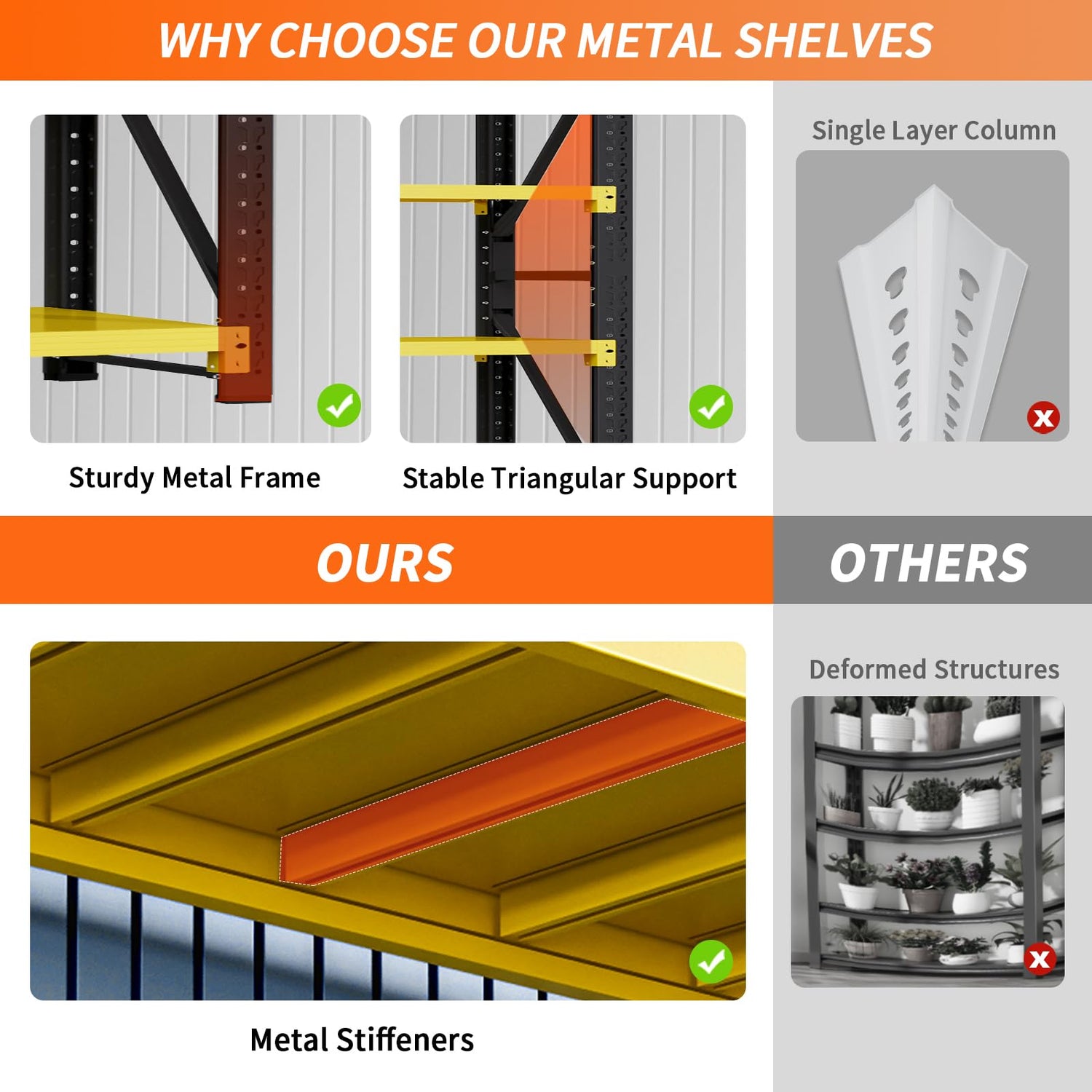 • 【3000LBS Capacity Heavy Duty Metal Garage Shelves】Constructed from high quality cold-rolled steel, the industrial shelving covered with rust-proof powder coated on all-metal surface, is more smooth and waterproof. Back of each level with extra multiple stiffeners can hold up to 750 lbs, and a total load weight capacity is 3000 lbs. This ensures metal shelf organizer can withstand heavy loads without warping or shaking, are more sturdy and durable than other ordinary racks.