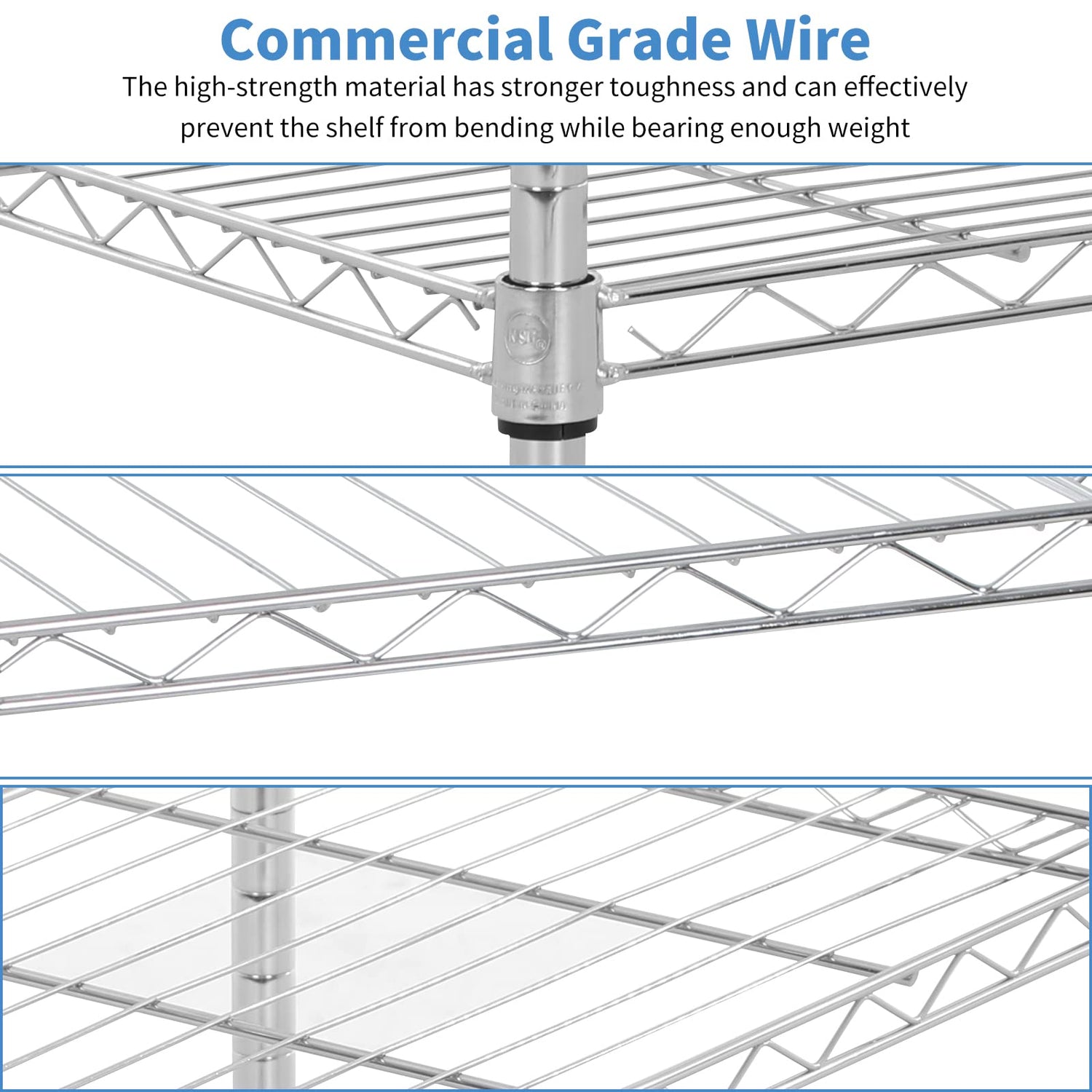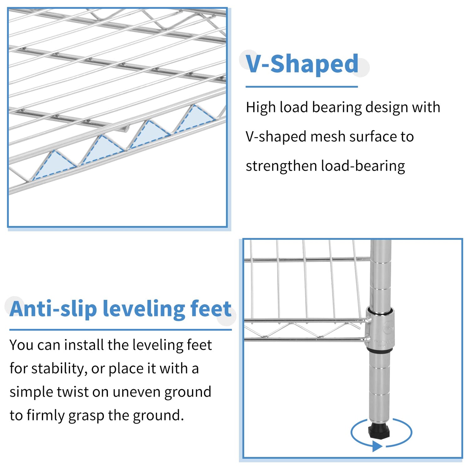 - Commercial Grade Shelving: High-quality certified wire shelving are made of high -intensity materials. They have strong toughness, high load capacity, toughness and resistance, which can effectively prevent metal shelf from bent when sufficient weight. The V-shaped mesh surface design enhances the bearing capacity. Friction plate design prevents mesh slippage and is NSF certified.